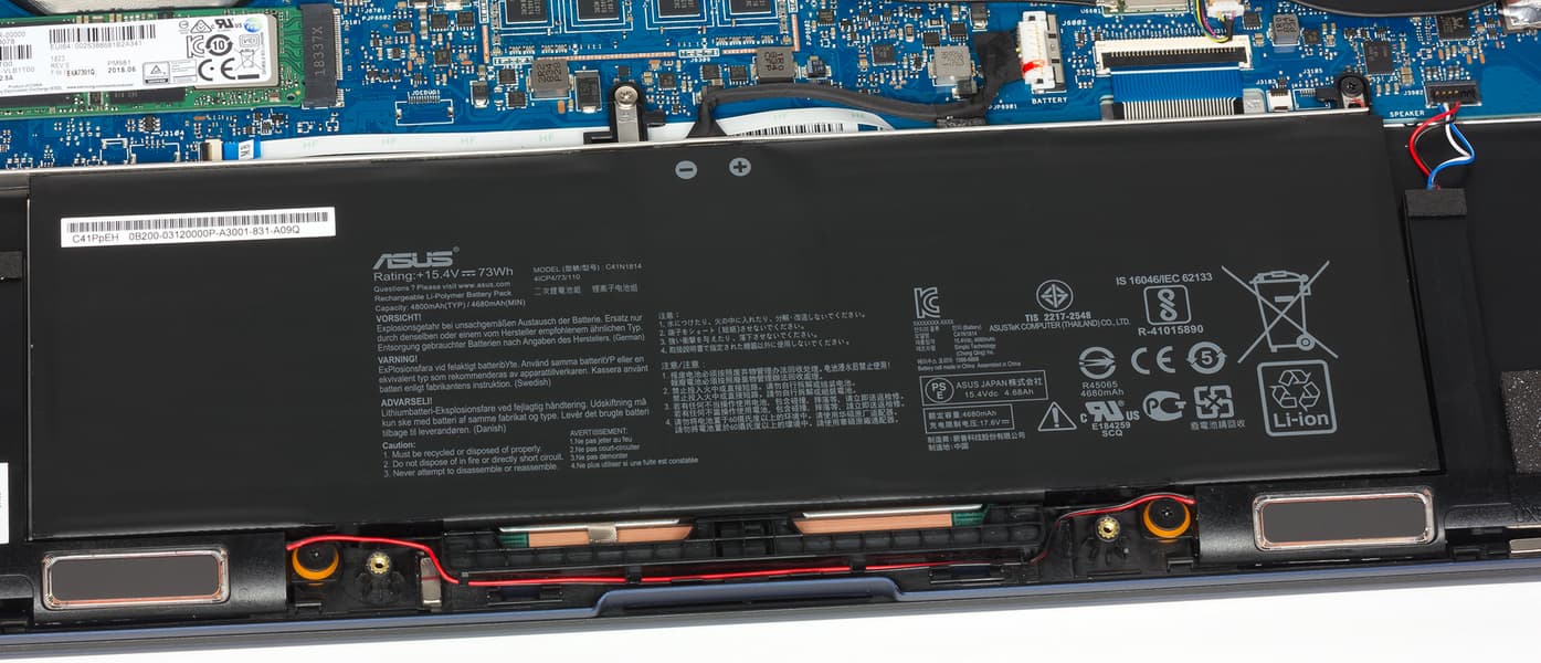 Ноутбук оснащен несъемной литий-полимерной аккумуляторной батареей емкостью 73 Вт·ч.