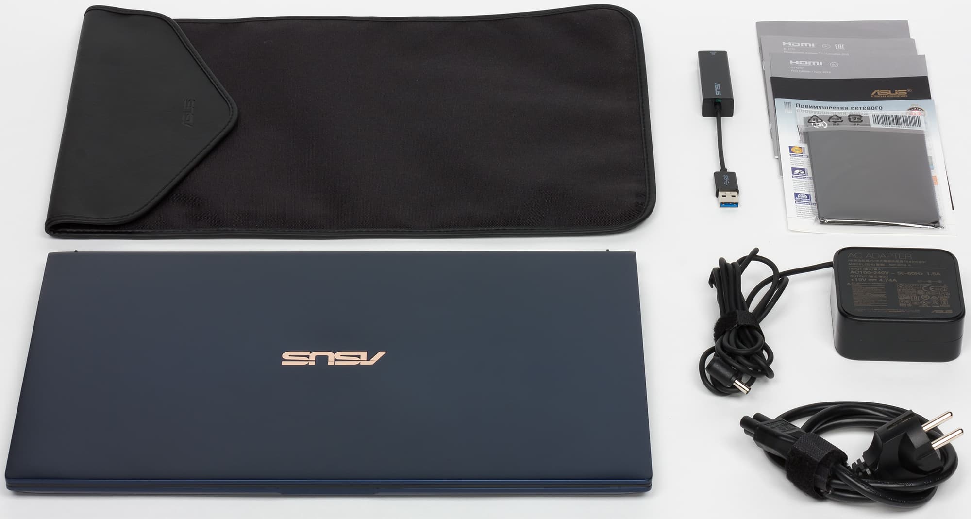 В комплекте прилагается адаптер питания мощностью 90 Вт, гарантийный талон, различные рекламные буклеты, матерчатый чехол для ноутбука и переходник с USB на RJ45.