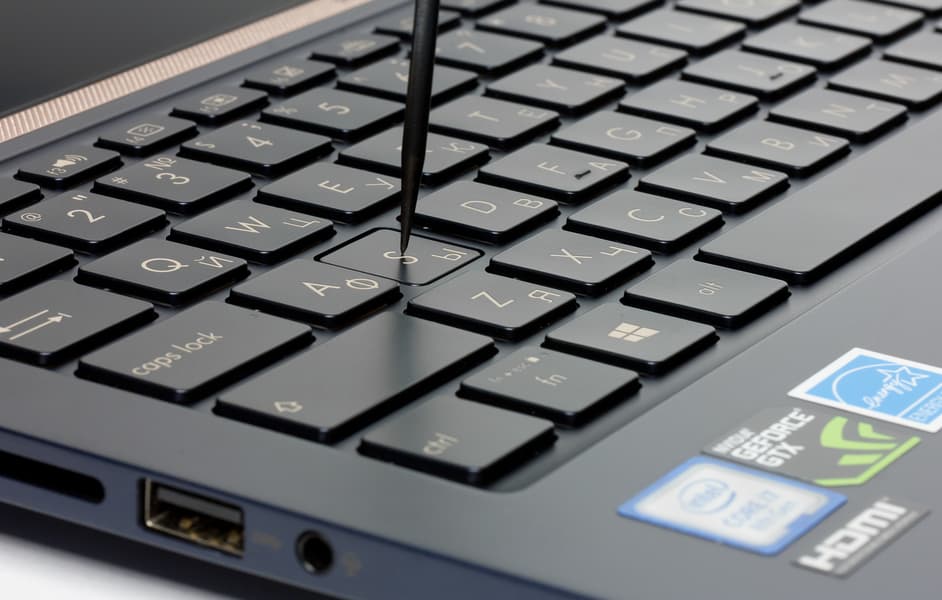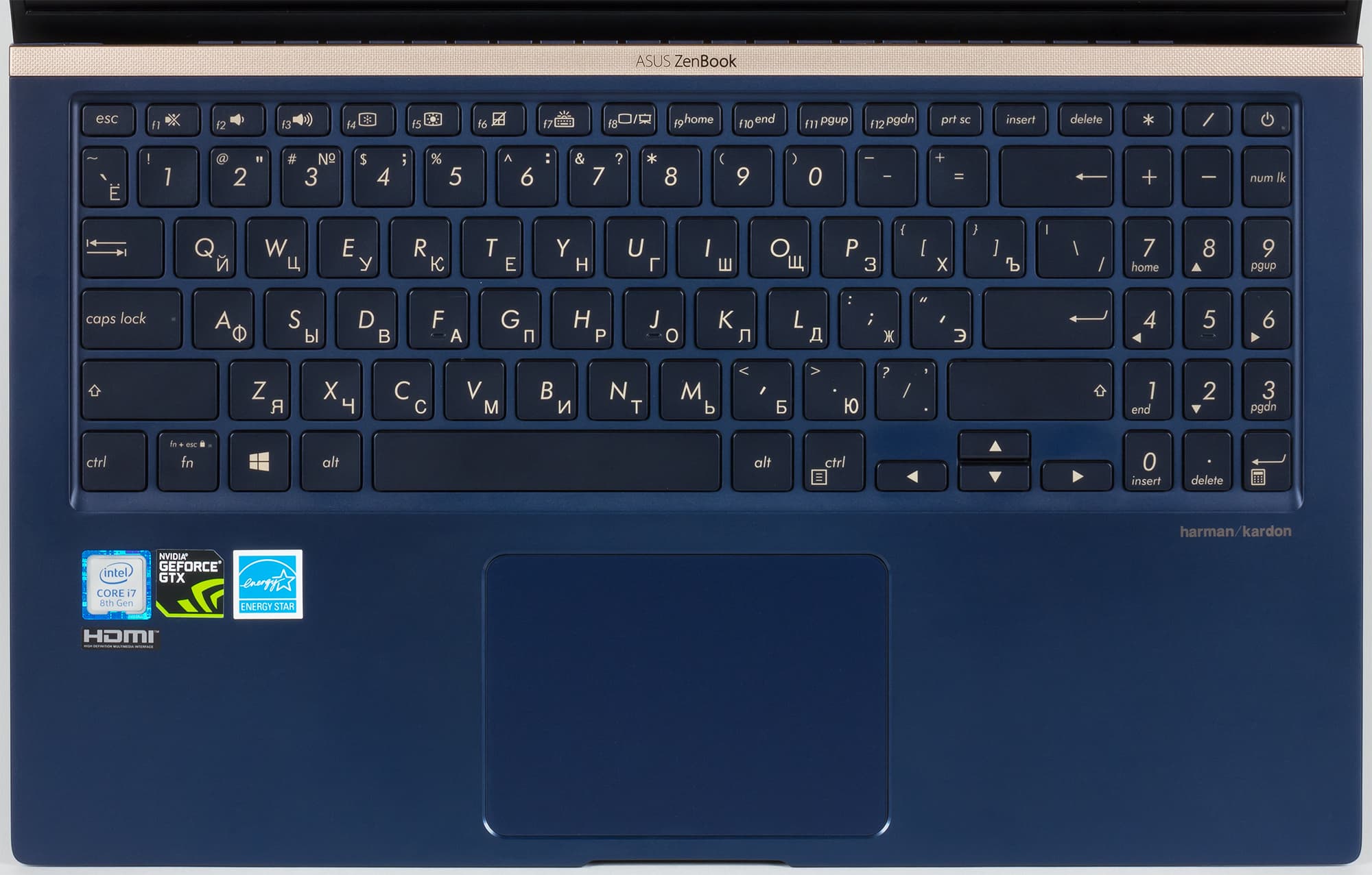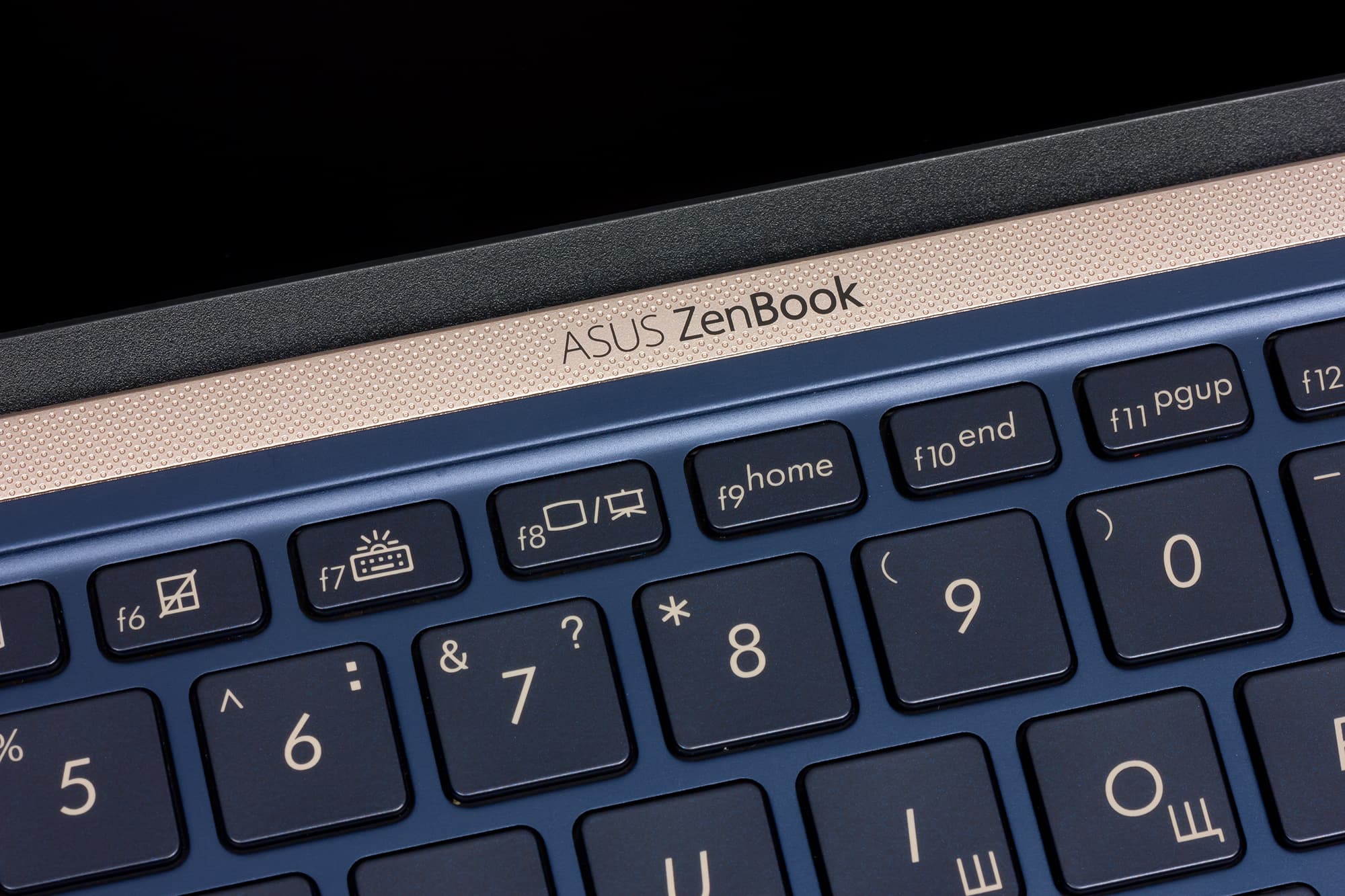В Asus ZenBook 15 UX533FD используется ставшая уже традиционной для современных ноутбуков клавиатура островного типа с увеличенным расстоянием между клавишами. Клавиши имеют размер 15,5×15,5 мм, а расстояние между ними — 3,5 мм. Глубина нажатия (ход клавиш) составляет 1,4 мм. Символы на клавишах имеют золотистый цвет. На черном фоне клавиш эти символы хорошо различимы даже в условиях плохого освещения.