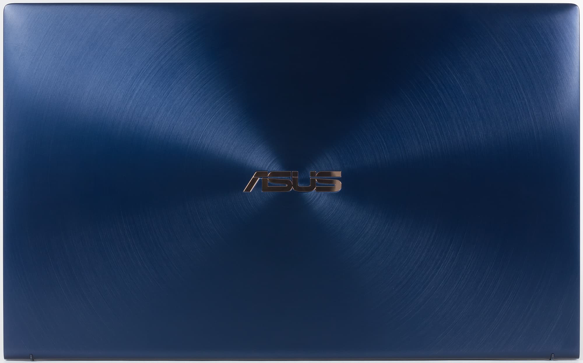 Корпус ноутбука целиком выполнен из алюминия темно-синего цвета. Поверхность крышки имеет фирменную отделку: она отшлифована в виде концентрических окружностей (стиль Zen). На крышке по центру красуется золотистого цвета логотип компании Asus.