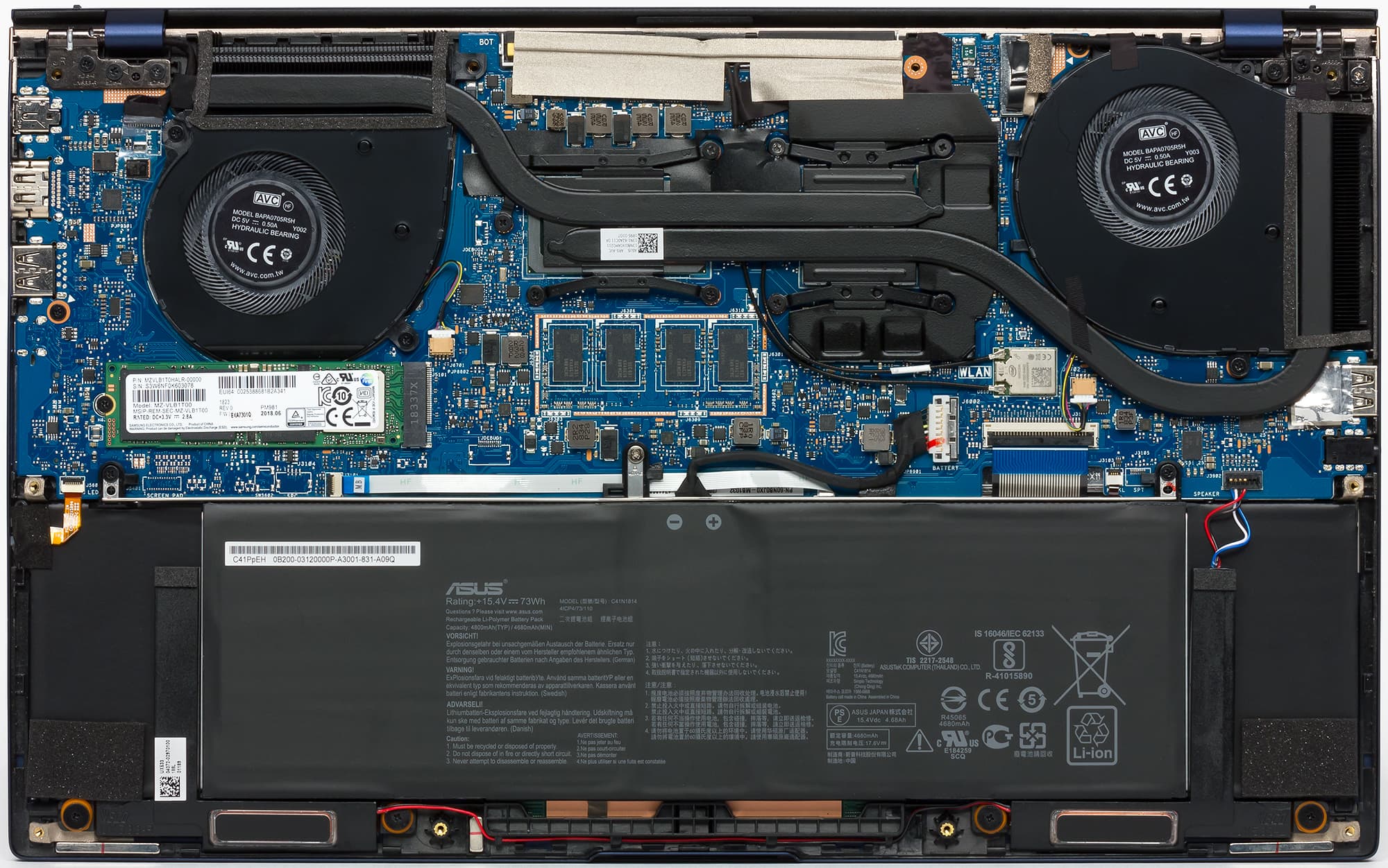 Пользователь может частично разобрать ноутбук Asus ZenBook 15 UX533FD. Открутив несколько винтиков, можно снять нижнюю панель, это позволит получить доступ к SSD-накопителю, Wi-Fi-модулю, аккумуляторной батарее и системе охлаждения.