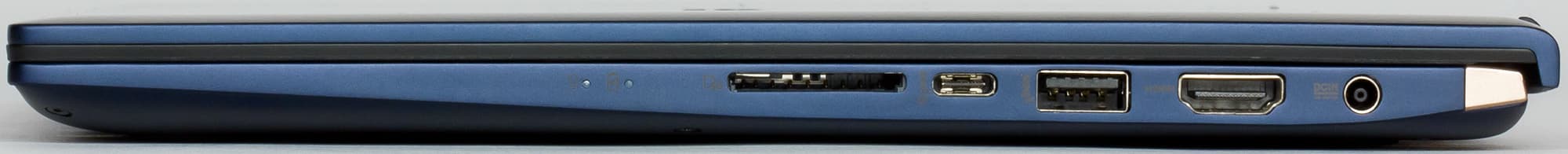 На правом торце корпуса ноутбука расположены: порт USB 3.1 (Type-C), порт USB 3.1 (Type-A), видеовыход HDMI, слот для карт памяти microSD, разъем питания, а также два миниатюрных индикатора состояния ноутбука.