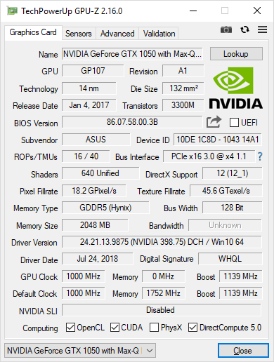 Базовая частота графического процессора Nvidia GeForce GTX 1050 (GP107) составляет 1000 МГц, а в режиме GPU Boost может достигать 1139 МГц. Как выяснилось в ходе тестирования, в режиме стрессовой загрузки (FurMark) видеокарты Nvidia GeForce GTX 1050 в установившемся режиме частота GPU составляет 1151 МГц, а частота памяти GDDR5 составляет 1752 МГц (эффективная частота 7 ГГц).
