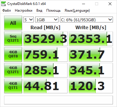 Утилита CrystalDiskMark 6.0.1 демонстрирует примерно аналогичные результаты.