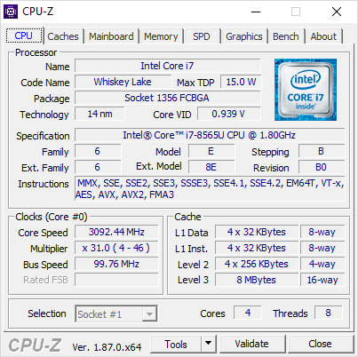 | Процессор | Intel Core i7-8565U (Whiskey Lake-U) | |