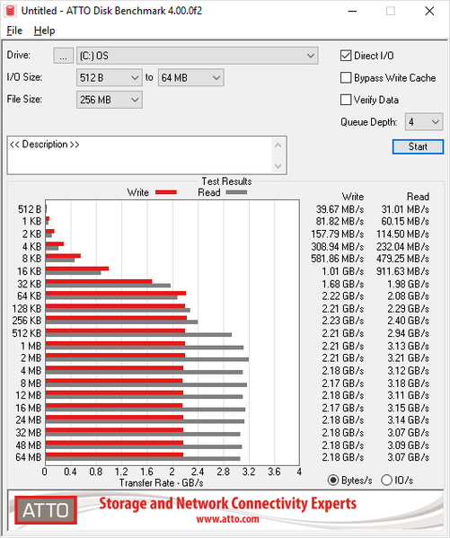 Утилита ATTO Disk Benchmark 4.00 определяет его максимальную скорость последовательного чтения на уровне 3,2 ГБ/с, а скорость последовательной записи — на уровне 2,2 ГБ/с, что является рекордно высоким результатом.
