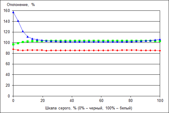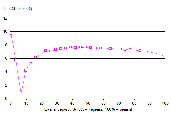 Что касается точности цветопередачи (дельта Е), то ее значение не превосходит 8 по всей шкале серого, что допустимо для данного класса экранов.
