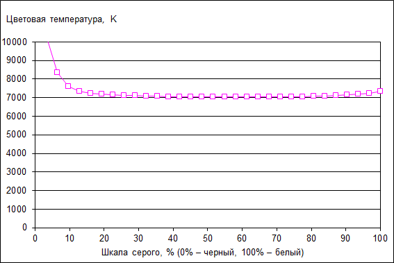 Цветовая температура ЖК-экрана ноутбука стабильна по всей шкале серого (темные области можно не учитывать из-за погрешности измерения) и составляет примерно 7000 K.