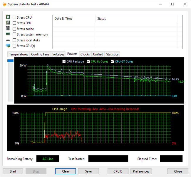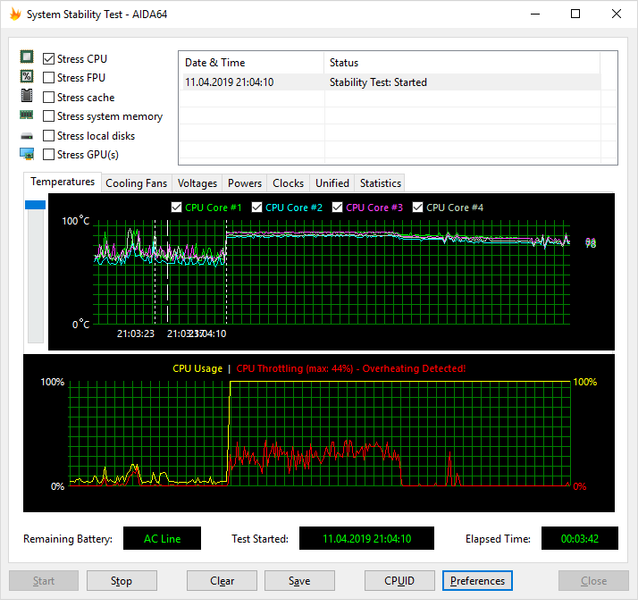 И опять-таки, по показаниям утилиты AIDA64, в этом режиме загрузки первоначально, пока ноутбук работает тихо, наблюдается троттлинг.