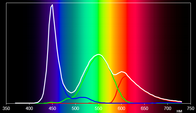 Светофильтры ЖК-матрицы не очень хорошо изолируют основные цвета, что типично для таких экранов. Спектры зеленого и красного цветов перекрываются.