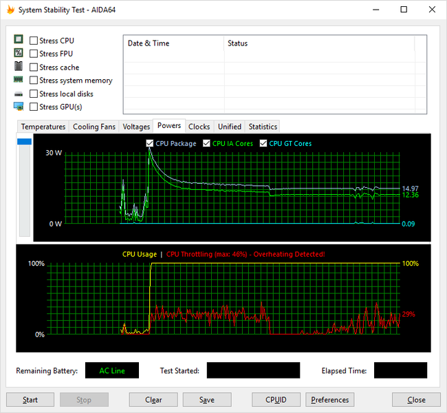 Температура ядер процессор в таком режиме составляет 80 °C, а мощность энергопотребления постепенно снижается до 15 Вт. Причем, по показаниям утилиты AIDA64, в этом режиме загрузки первоначально наблюдается троттлинг. Все дело в том, что ноутбук не спешит включать вентиляторы и поначалу даже в режиме стрессовой загрузки работает очень тихо. Когда вентиляторы включаются, троттлинг пропадает.