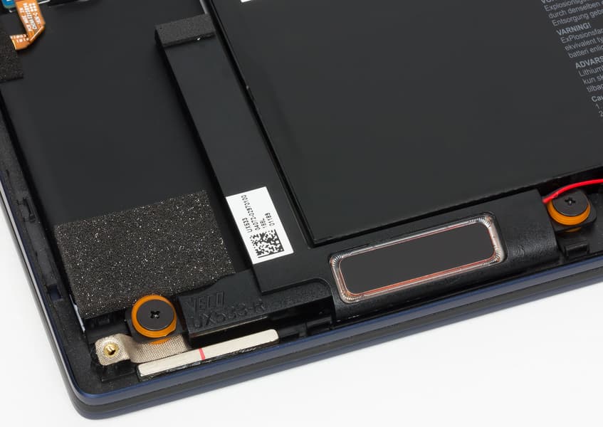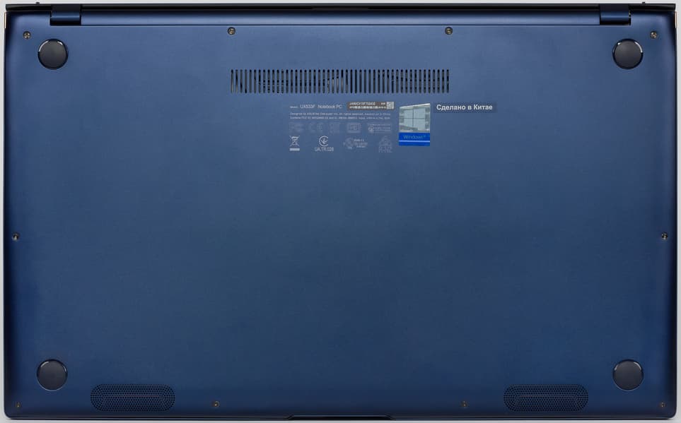 Нижняя металлическая панель корпуса сделана матовой и имеет такой же цвет, как и крышка корпуса. На этой панели, закругленной к краям, есть лишь сетки динамиков и вентиляционные отверстия.