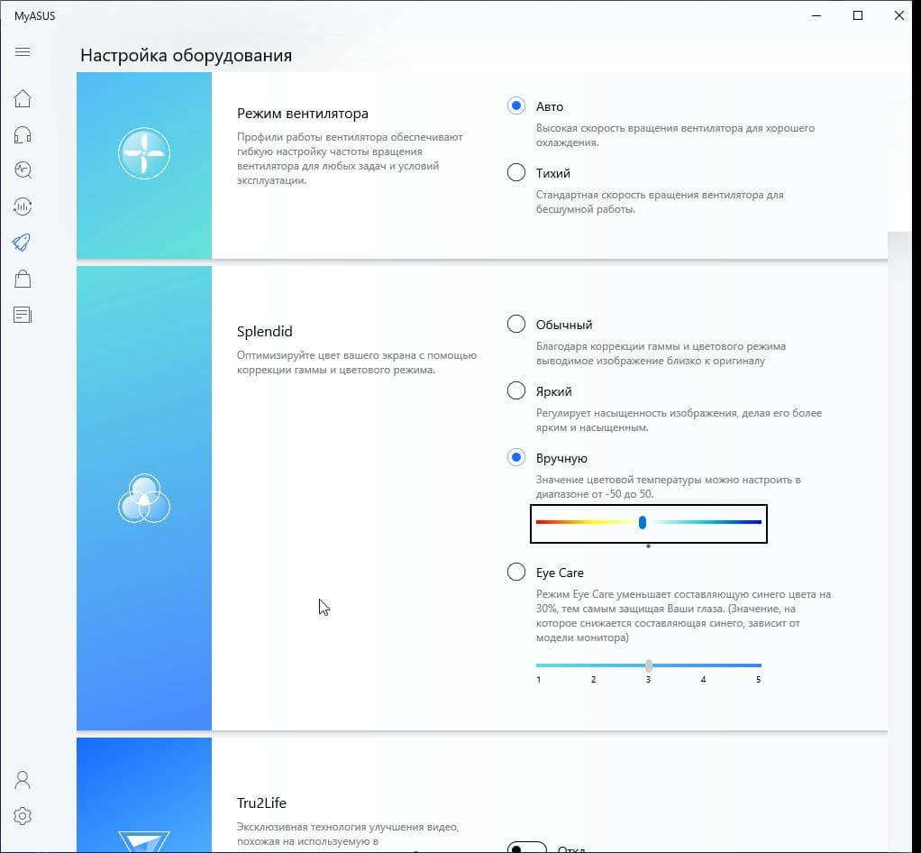 Присутствует фирменная утилита MyAsus на вкладке которой можно изменить ряд настроек основного экрана: выбрать профиль цветокоррекции и вручную подстроить цветовой баланс. Также есть модная функция (Eye Care) для снижения интенсивности синей компоненты (впрочем, в Windows 10 она и так есть). Почему такая коррекция может быть полезной, рассказано в статье про iPad Pro 9,7″. В любом случае, при работе за ноутбуком на ночь глядя лучше снизить яркость экрана до минимального, но еще комфортного уровня. Желтить картинку нет никакого смысла.