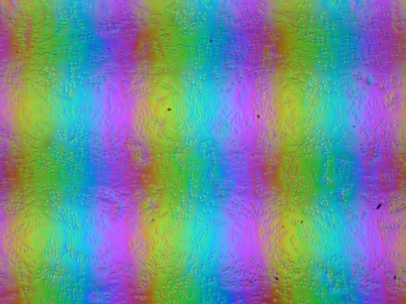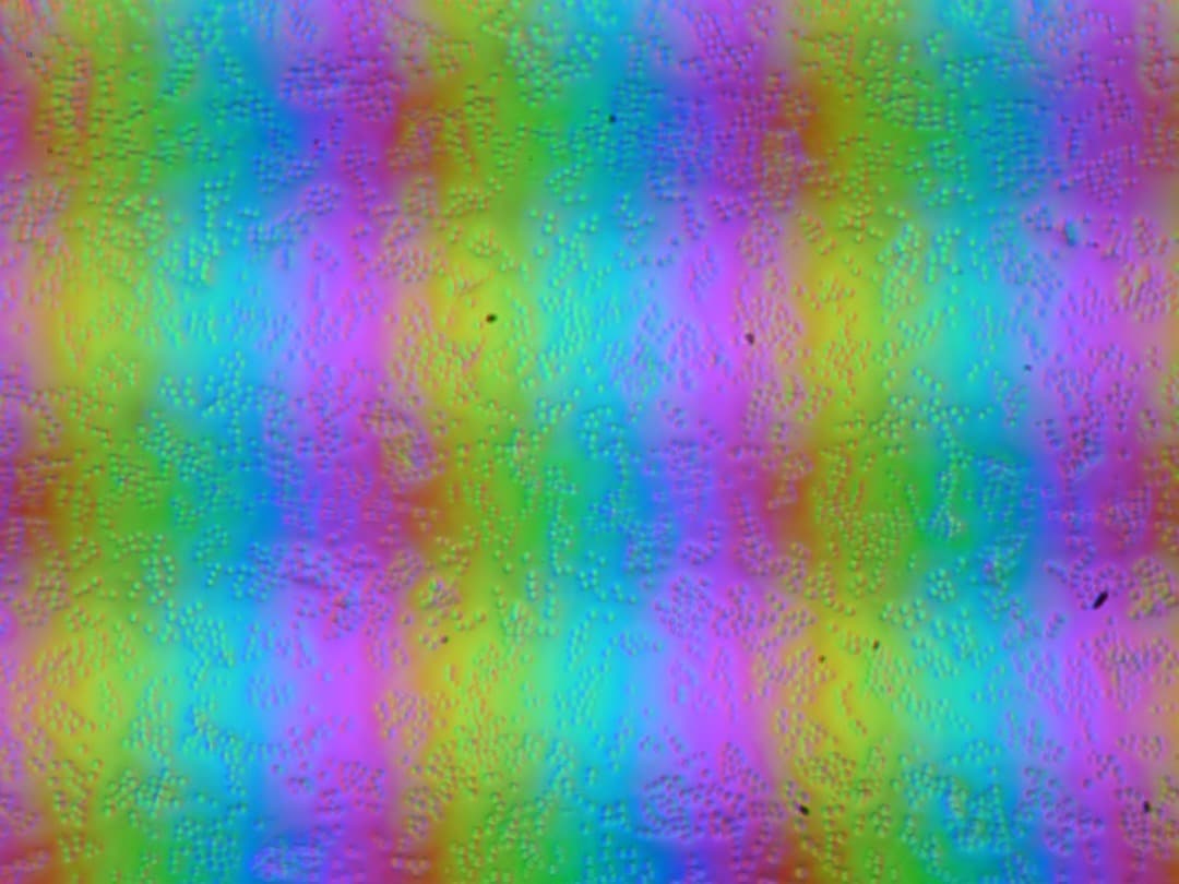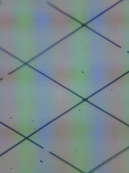 Зерно этих дефектов в несколько раз меньше размеров субпикселей (масштаб фотографий примерно одинаковый), поэтому фокусировка на микродефектах и «перескок» фокуса по субпикселям при изменении угла зрения выражены слабо, из-за этого нет и «кристаллического» эффекта.