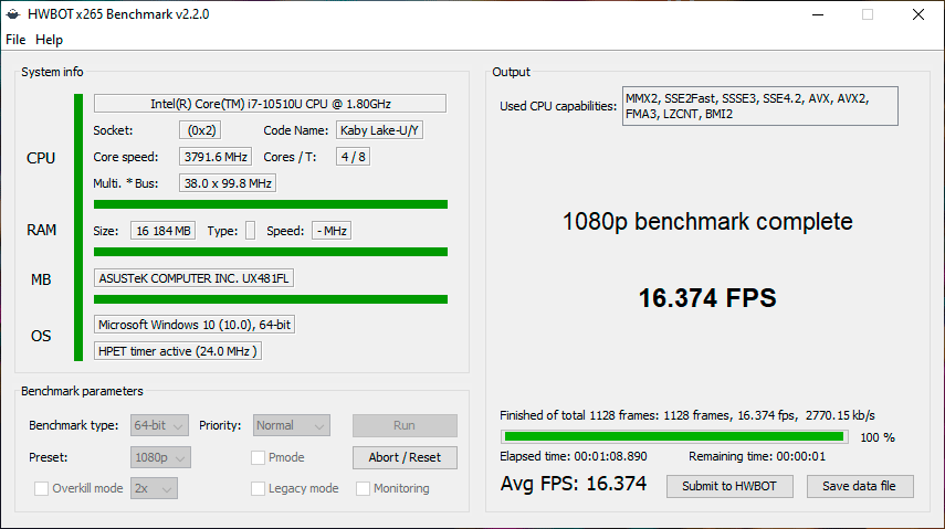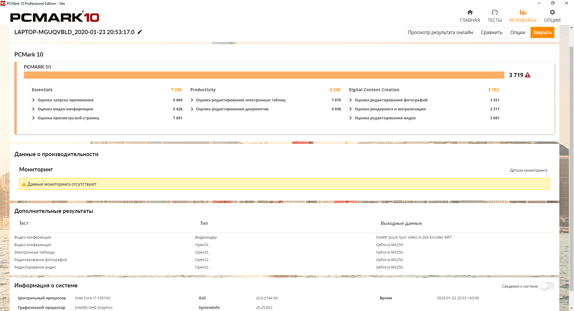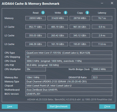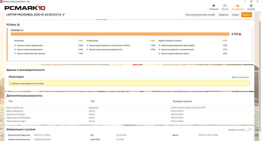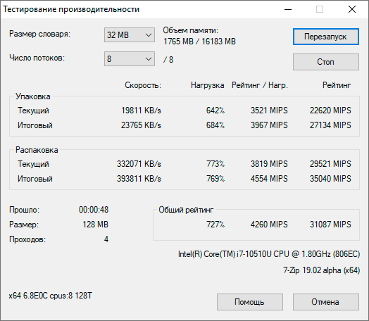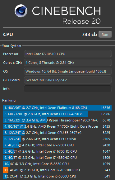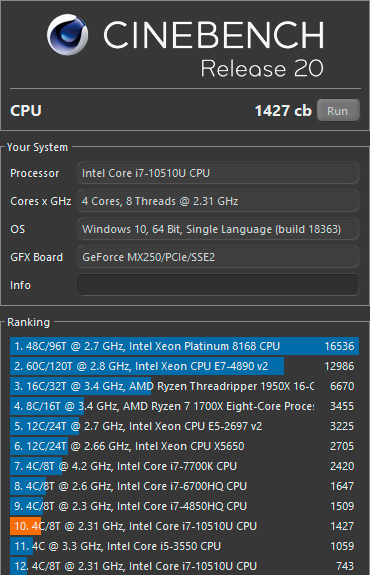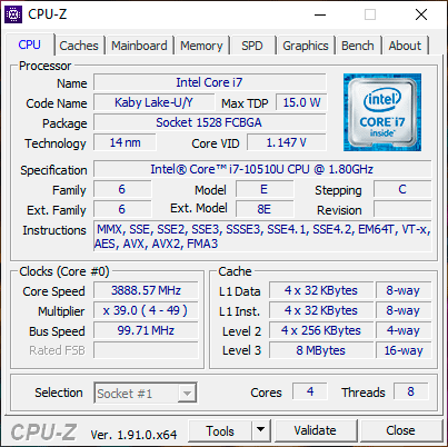 В нашей конфигурации ноутбука роль центрального процессора выполняет 14-нанометровый четырехъядерный процессор Intel Core i7-10510U с поддержкой Hyper-Threading. Он может работать на частотах от 1,8 до 4,6 ГГц при максимальном уровне TDP 25 Вт.