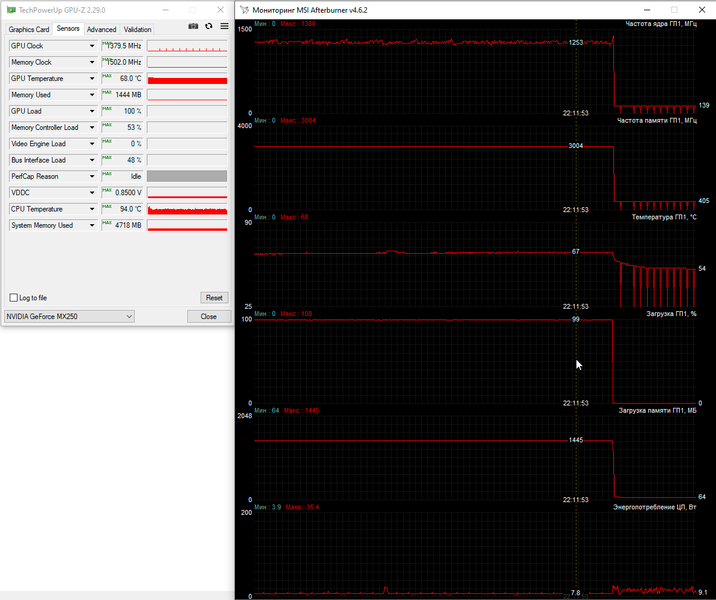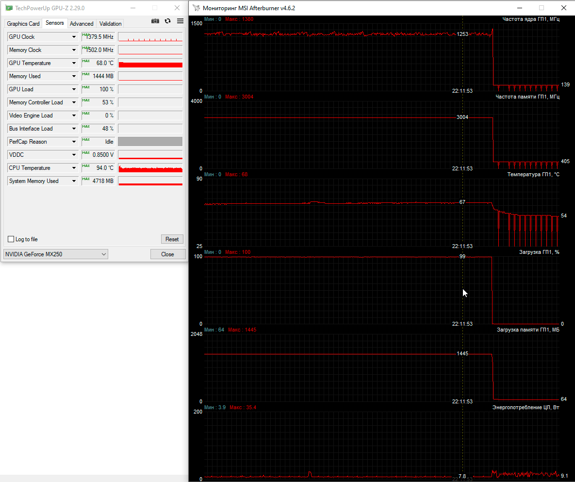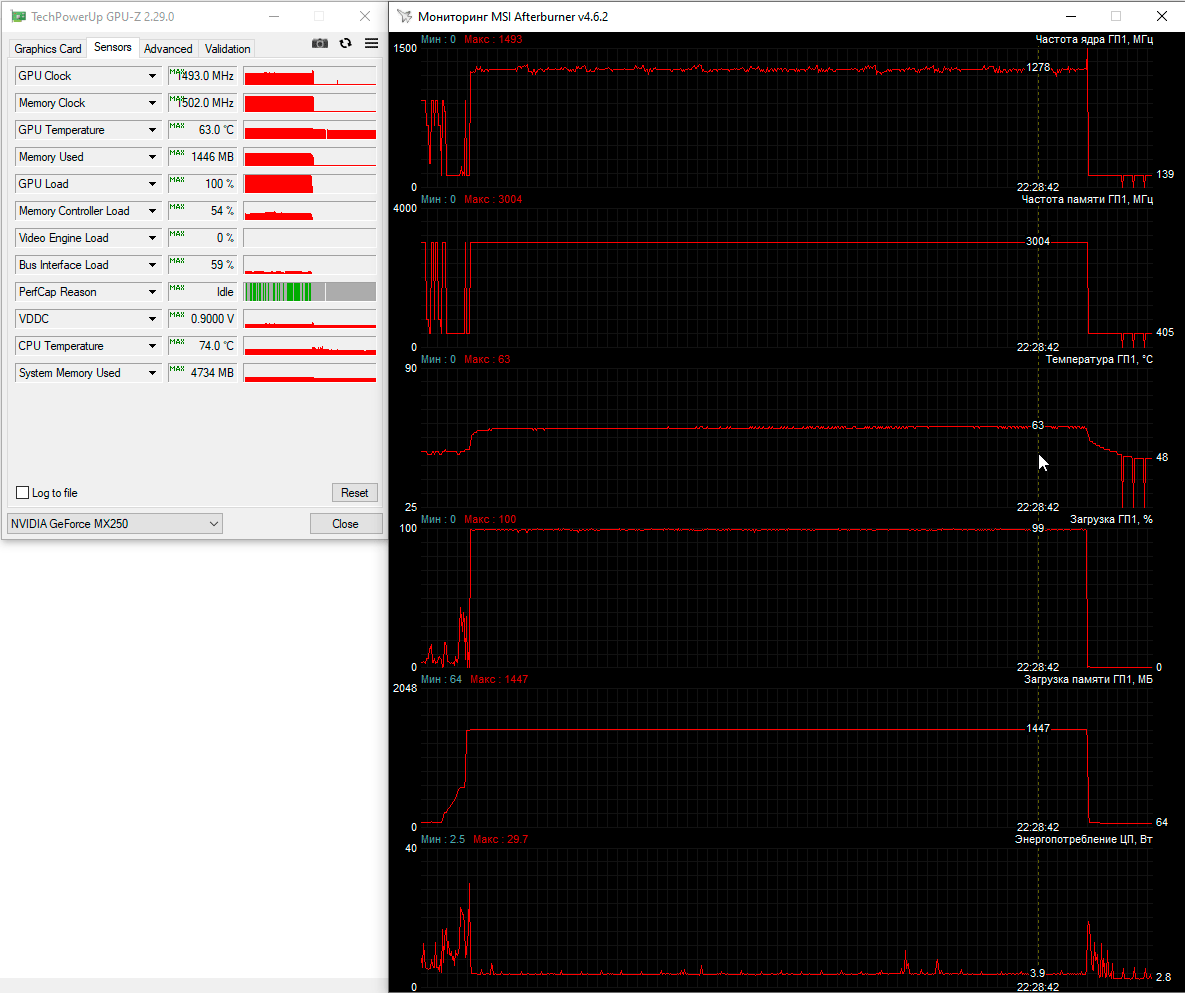 А вот видеокарта Nvidia GeForce MX250 функционирует практически на одинаковых частотах вне зависимости от режима работы ноутбука. Разница лишь в том, что при работе от электросети ядро видеокарты греется на 4 °C сильнее в пике нагрузки, чем при работе от аккумулятора.