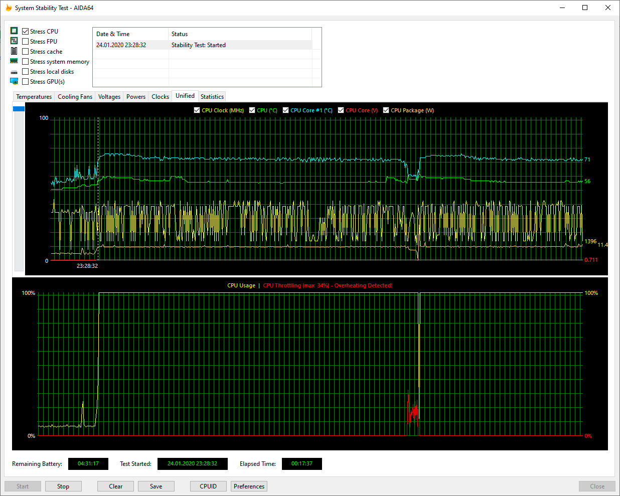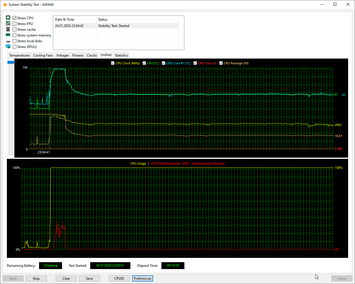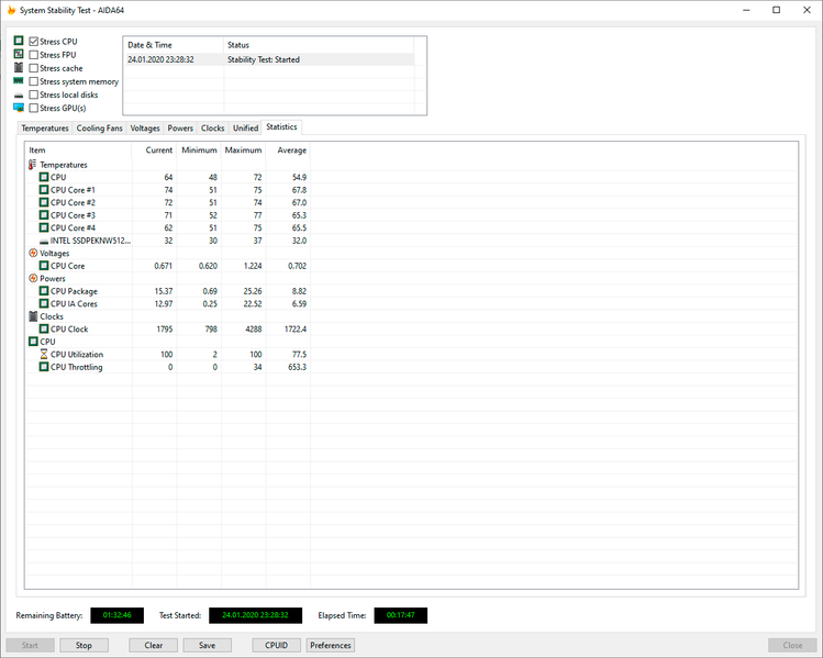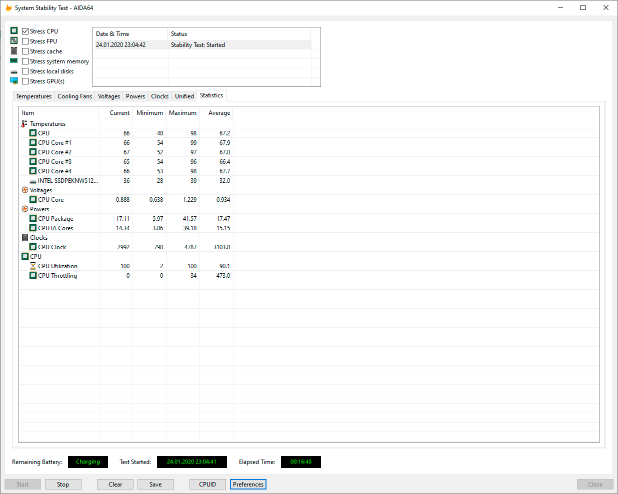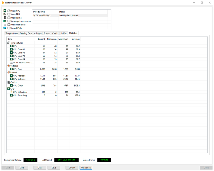 За первую минуту после начала теста процессор прогрелся почти до 100 °C (до 98 градусов, если быть точным), и активировался режим тротлинга. Но затем плавно разогнались оба вентилятора системы охлаждения, которые стабилизировали температуры ядер на отметках 65-67 °C. Уровень шума при этом был очень высоким. Частота процессора составляла примерно 3,1 ГГц при напряжении 0,922 В и уровне потребления 17 Вт.