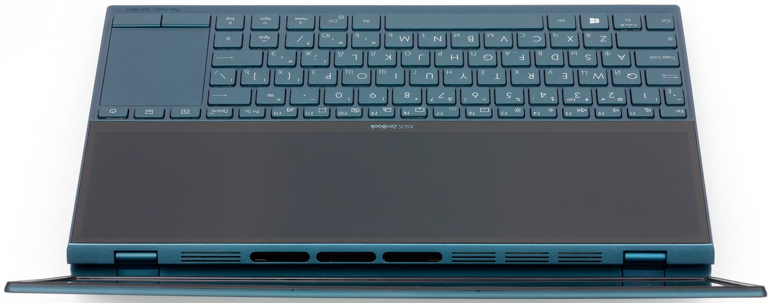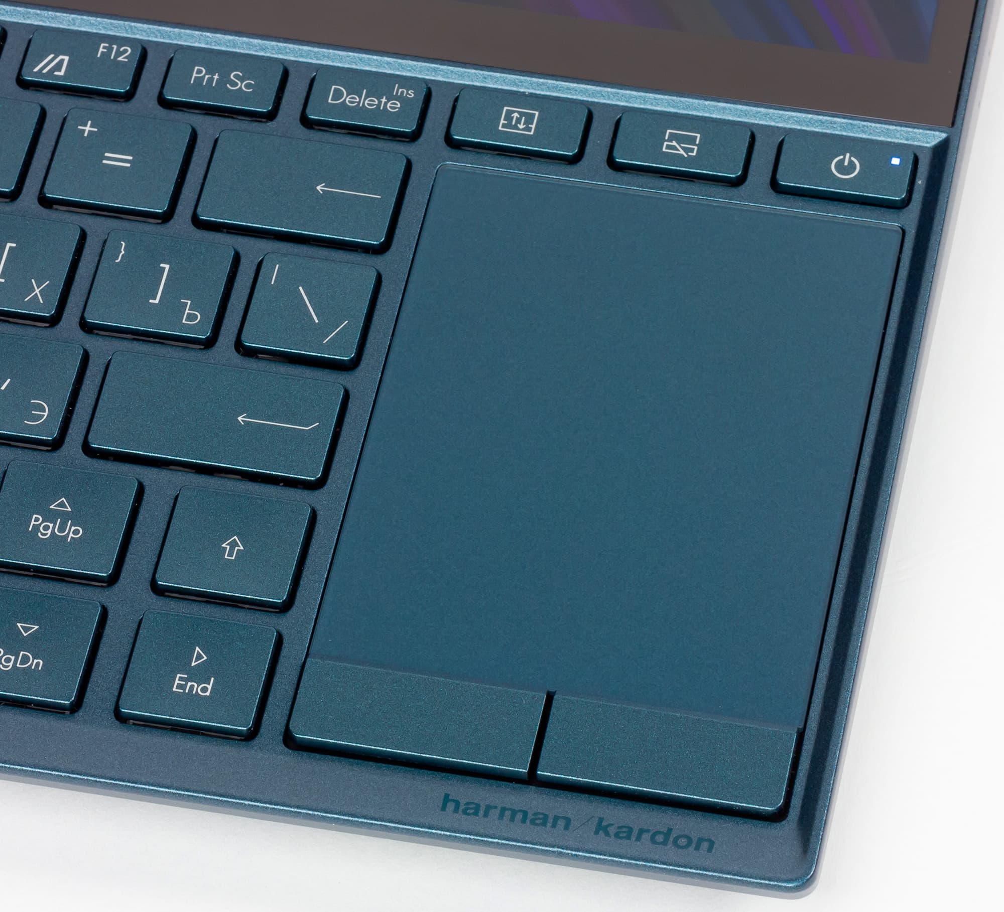 Тачпад здесь простой с двумя клавишами. Над ним расположены клавиша включения ноутбука и две клавиши для управления ScreenPad Plus.