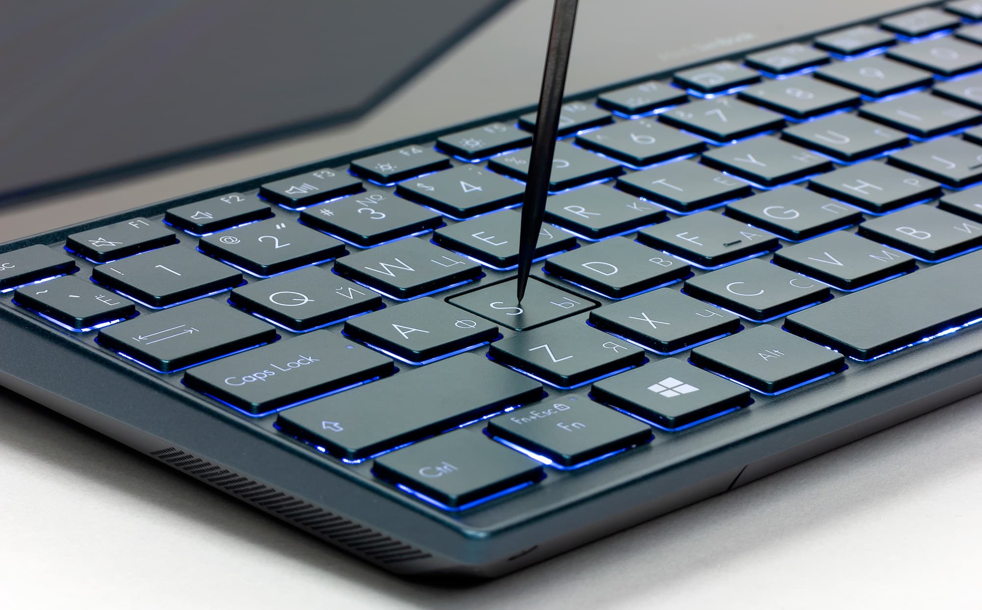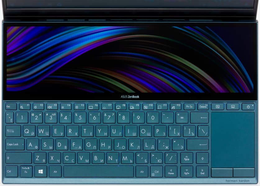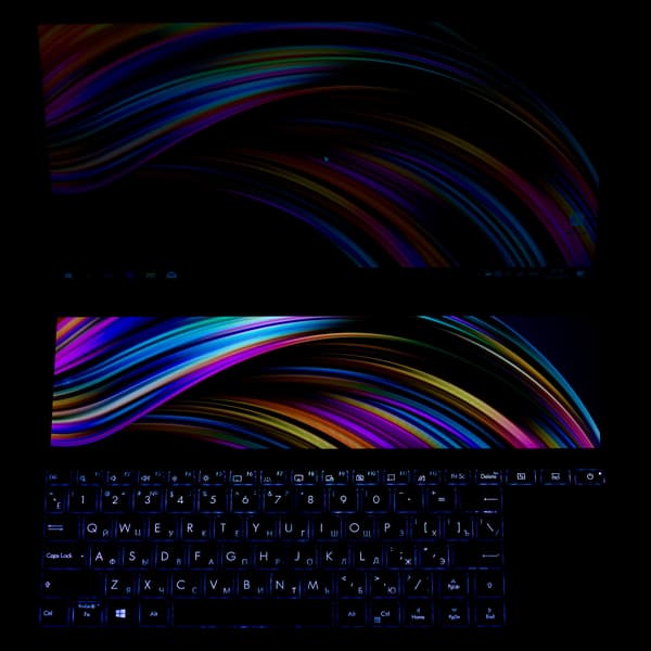 Клавиатура работает практически бесшумно, но после механической клавиатуры обратной связи при печати на ноутбуке Asus ZenBook Duo UX481F не хватает. Зато здесь есть подсветка, гармонично вписывающаяся в пару к дополнительному экрану.