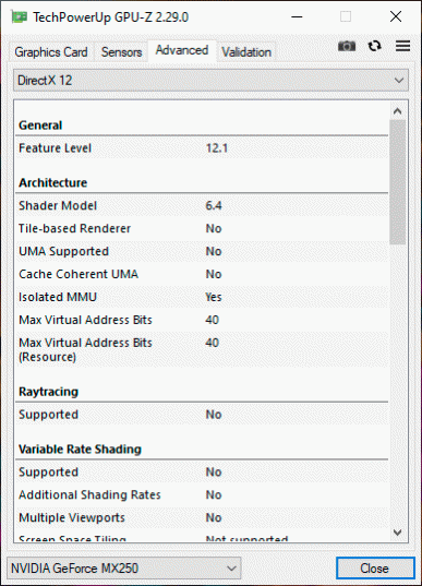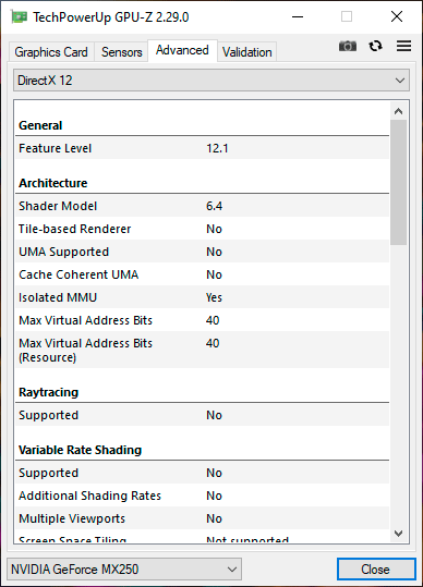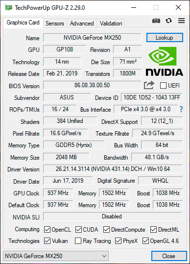 Для не новых игр со средними настройками качества графики предусмотрена дискретная видеокарта Nvidia GeForce MX250 (10-ваттная версия), оснащенная двумя гигабайтами GDDR5 производства Hynix (маркировка H5GC8H24AJR) на 64-битной шине с эффективной частотой 6 ГГц.