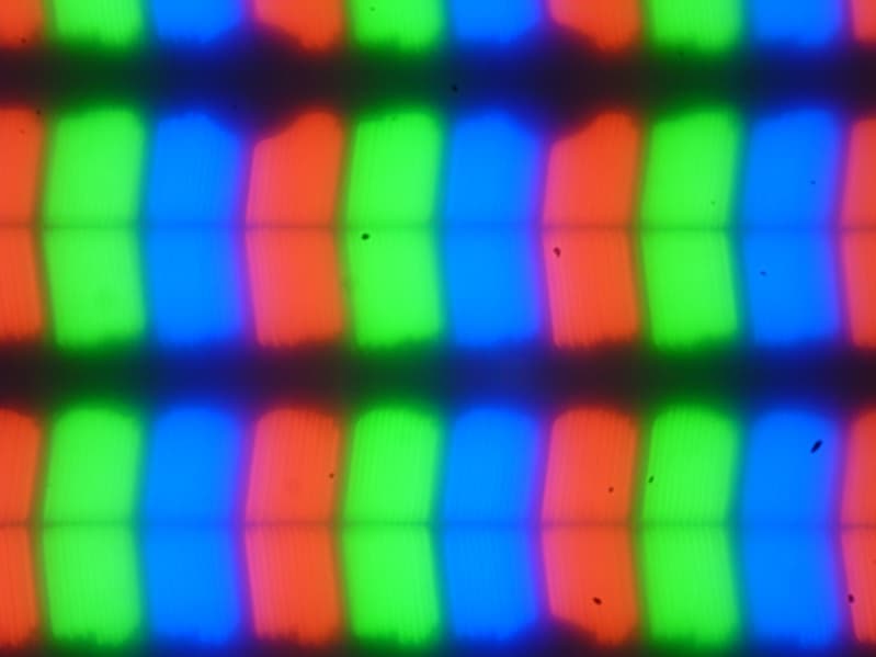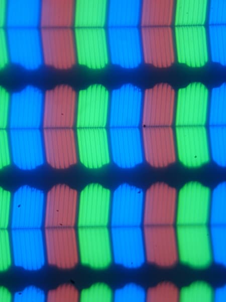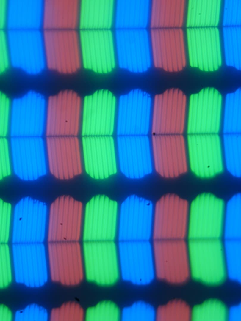 В основном и в дополнительном экранах Asus ZenBook Duo UX481F используются матрицы типа IPS. Микрофотографии демонстрируют типичную для IPS структуру субпикселей (черные точки — это пыль на матрице фотоаппарата):