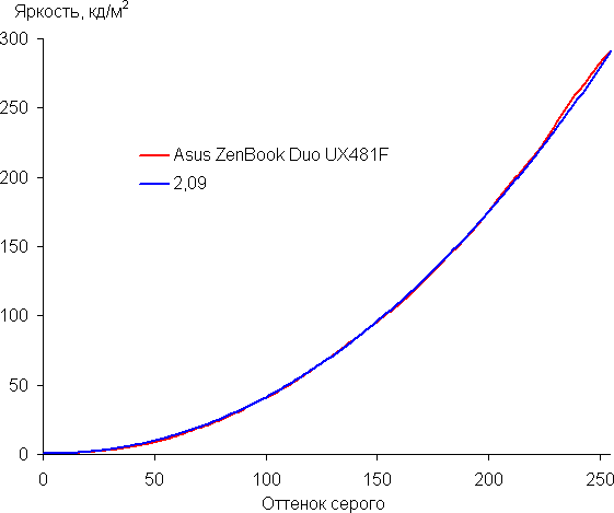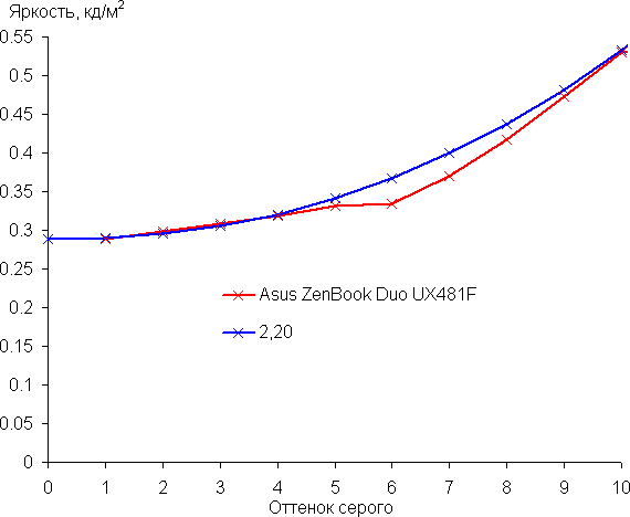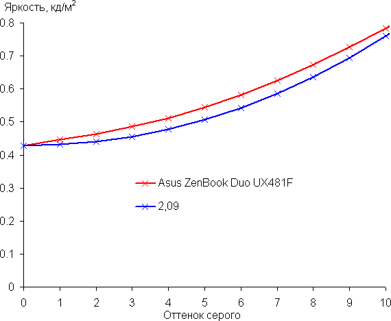 Подведем итоги. Оба экрана ноутбука Asus ZenBook Duo UX481F имеют достаточно высокую максимальную яркость, чтобы устройством можно было пользоваться светлым днем вне помещения, загородившись от прямого солнечного света. Однако при работе от батареи яркость дополнительного экран снижается — впрочем, его можно вообще отключить, заодно продлив время автономной работы. В полной темноте яркость можно понизить до комфортного уровня. Качество обоих экранов в целом сопоставимое, но дополнительный ведет себя чуть хуже на свету — глянцевая поверхность отражает все яркое, что находится сверху, — а также у дополнительного экрана заметно хуже равномерность черного поля и бледные цвета. У основного равномерность черного заметно лучше и цвета естественные (охват sRGB). Недостатком обоих экранов является низкая стабильность черного к отклонению взгляда от перпендикуляра к плоскости экрана.