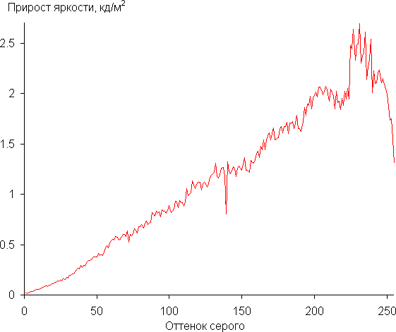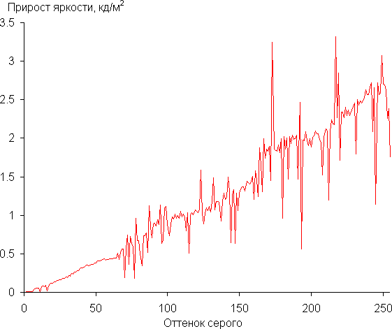 Для основного экрана мы измерили яркость 256 оттенков серого (от 0, 0, 0 до 255, 255, 255). График ниже показывает прирост (не абсолютное значение!) яркости между соседними полутонами: