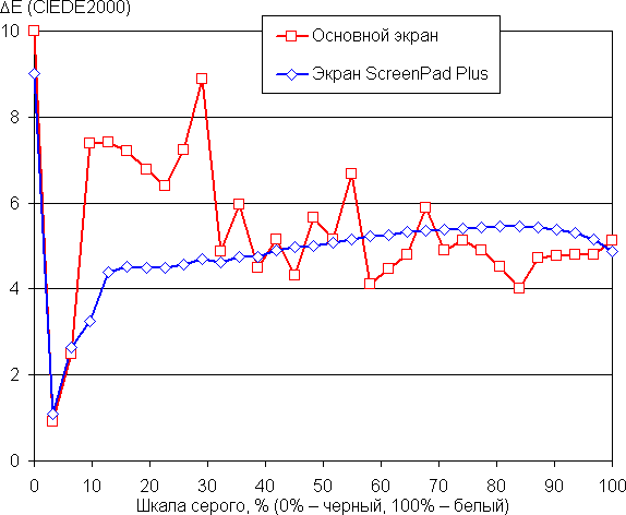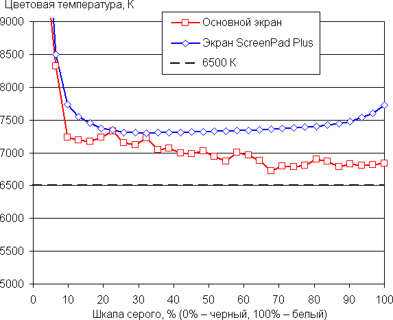У обоих экранов по умолчанию баланс оттенков на шкале серого хороший, так как цветовая температура не сильно выше стандартных 6500 К, а отклонение от спектра абсолютно черного тела (ΔE) ниже 10, что для потребительского устройства считается приемлемым показателем. При этом цветовая температура и ΔE мало изменяются от оттенка к оттенку (но у основного экрана разброс все же выше) — это положительно сказывается на визуальной оценке цветового баланса. (Самые темные области шкалы серого можно не учитывать, так как там баланс цветов не имеет большого значения, да и погрешность измерений цветовых характеристик на низкой яркости большая.)