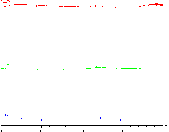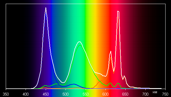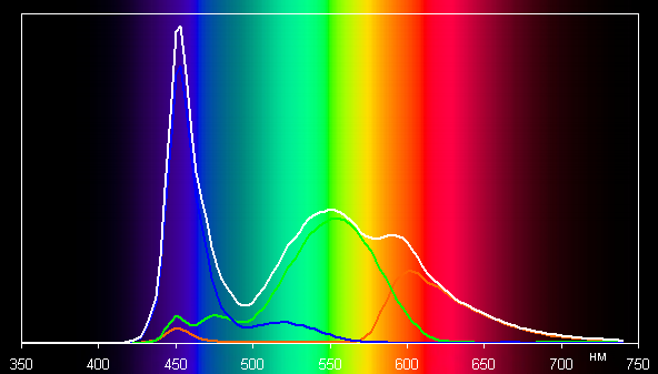 Поэтому визуально цвета на этом экране имеют естественную насыщенность. Ниже приведен спектр для белого поля (белая линия), наложенный на спектры красного, зеленого и синего полей (линии соответствующих цветов):