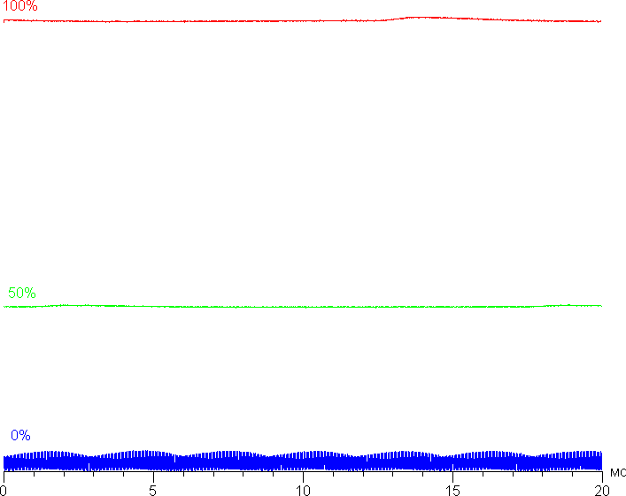 Мерцания (ни видимого, ни выявляемого в тесте на стробоскопический эффект) ни на каком уровне яркости нет ни на основном, ни на дополнительном экране. Если подходить совсем строго, то зависимости яркости от времени в случае основного экрана на низкой яркости выявляют наличие модуляции, но ее характер (частота порядка 25 кГц и небольшая относительно максимальной яркости амплитуда) такой, что никогда и ни при каких условиях мерцание не обнаруживается и не может никак влиять на зрение пользователя.