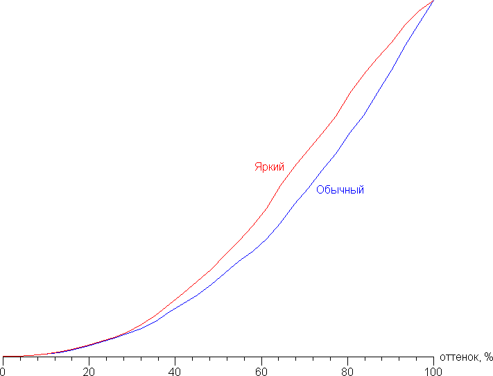 При выборе профиля Яркий изображение немного высветляется, что сопровождается изменением гамма-кривой:
