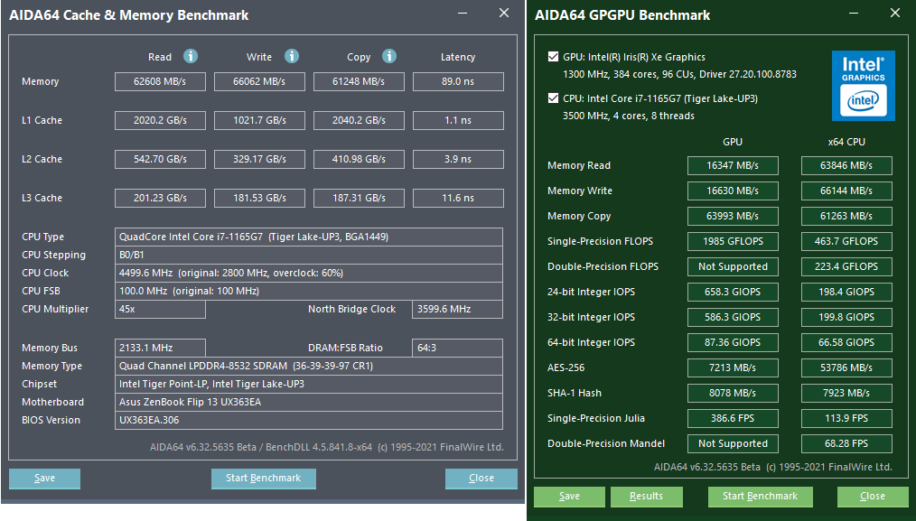 Процессоры в этих ноутбуках Asus ZenBook одинаковые, а производительность, как видим, отличается. Причина проста: в ZenBook 14 UX435EG процессор охлаждается эффективнее и работает на более высокой частоте ядра (2,5 ГГц против 2,1 ГГц у ZenBook Flip 13 UX363EA).