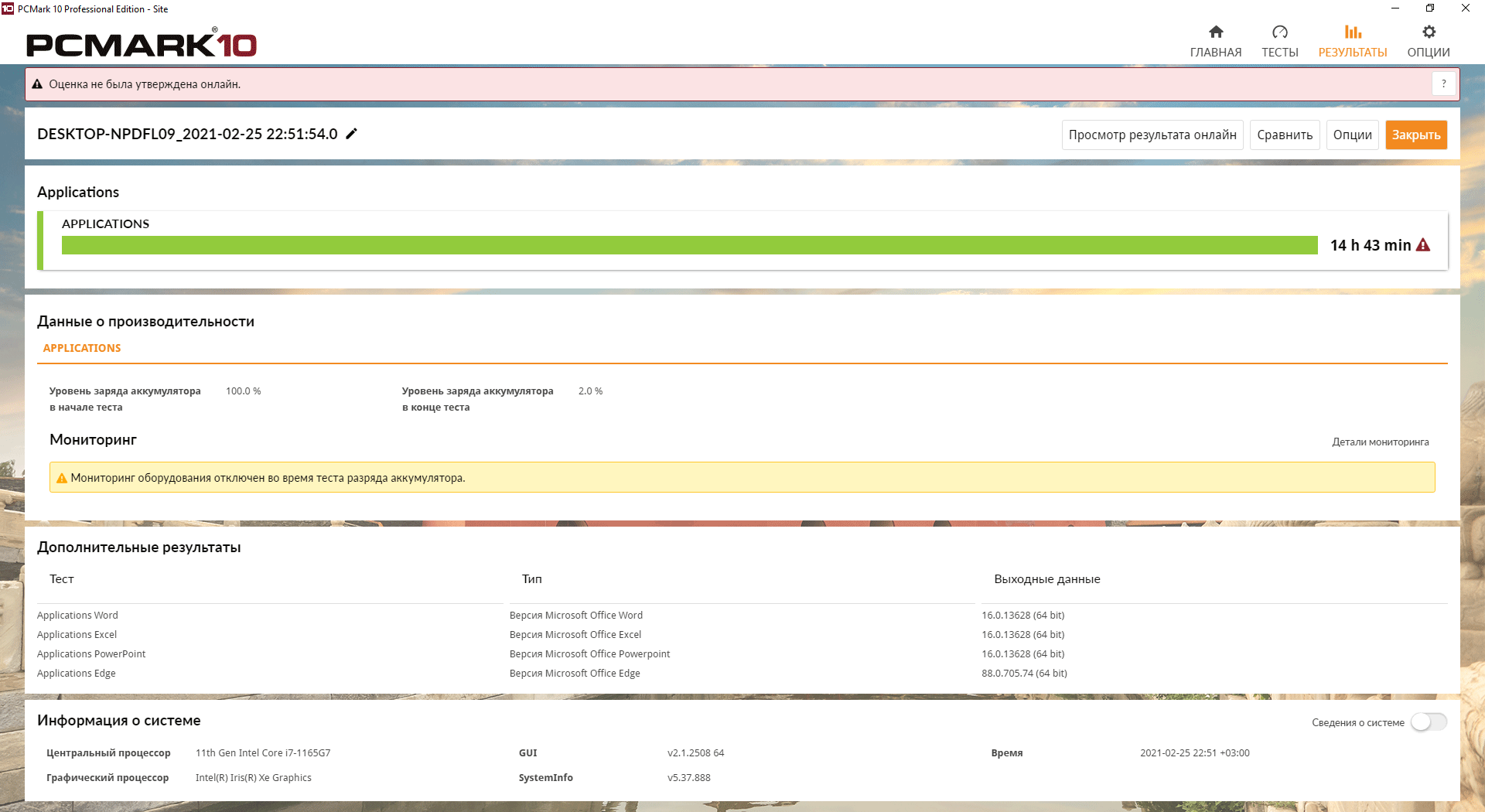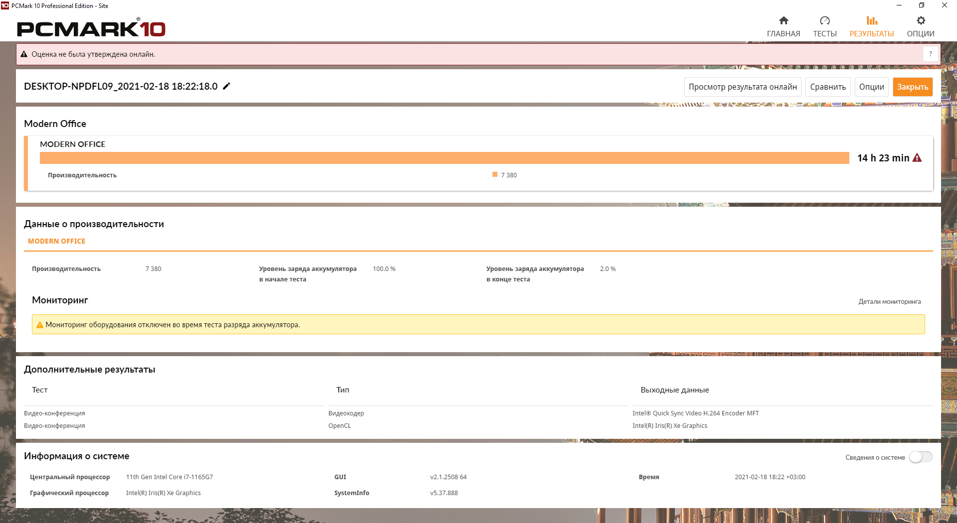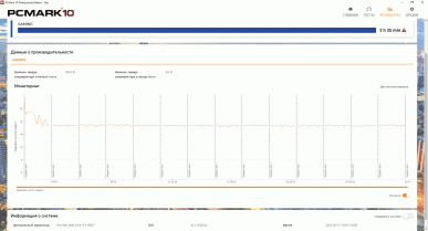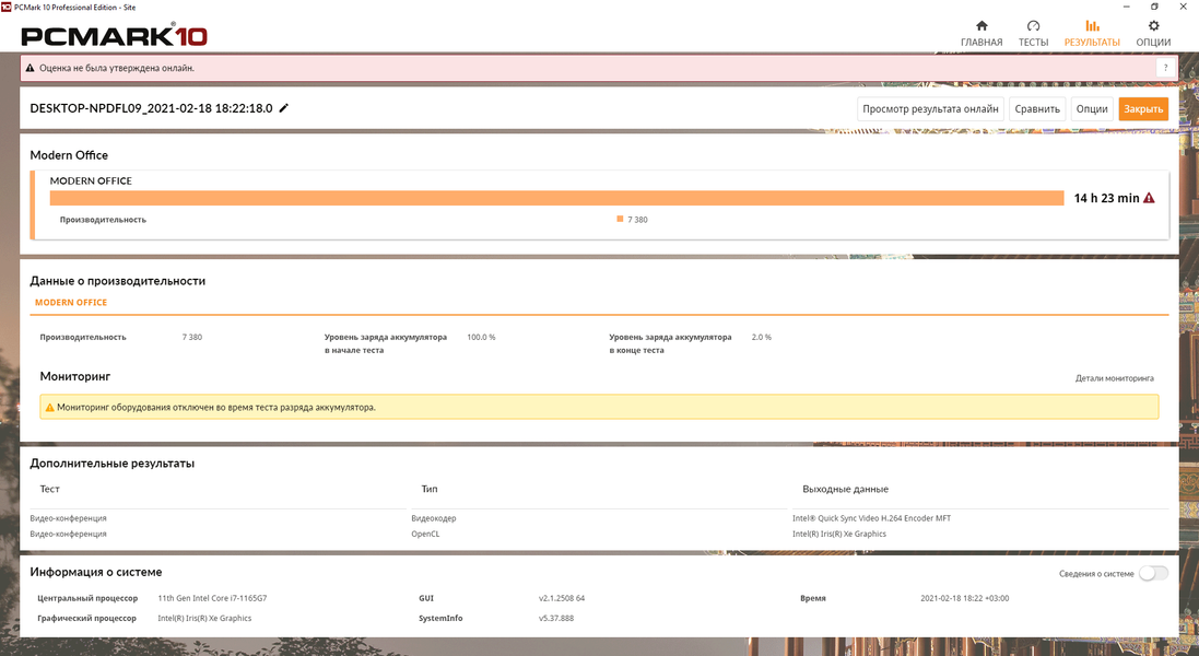 Мы тестировали ультрабук при яркости экрана 100 кд/м² (что в данном случае эквивалентно 44%) в тестовом пакете PCMark’10. Сетевые соединения и звук не отключались. В эмуляции офисной работы (тест Applications) до полного отключения ультрабук проработал почти 15 часов, а также 3,5 часа при тестировании игровой производительности. Великолепные результаты!