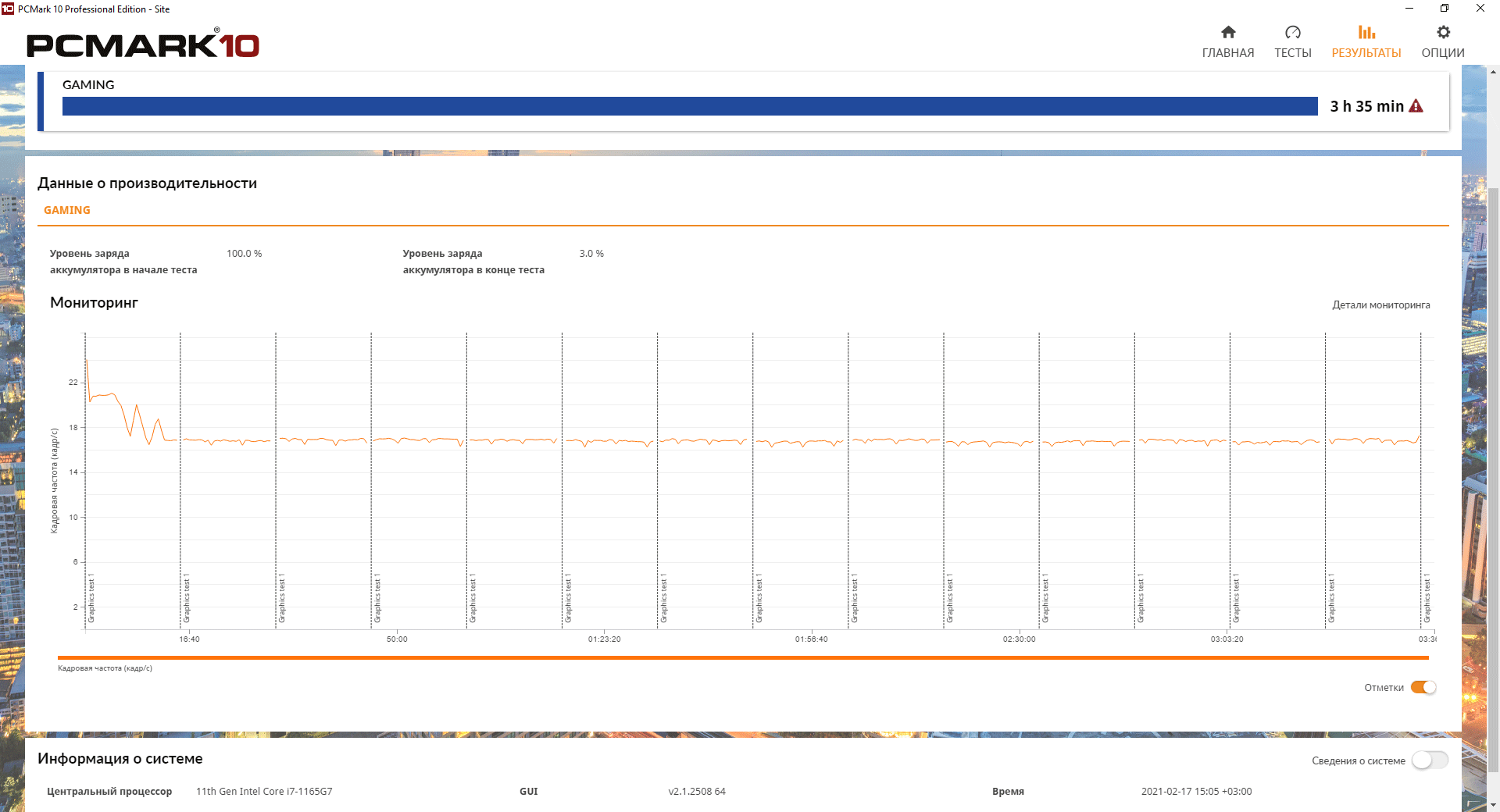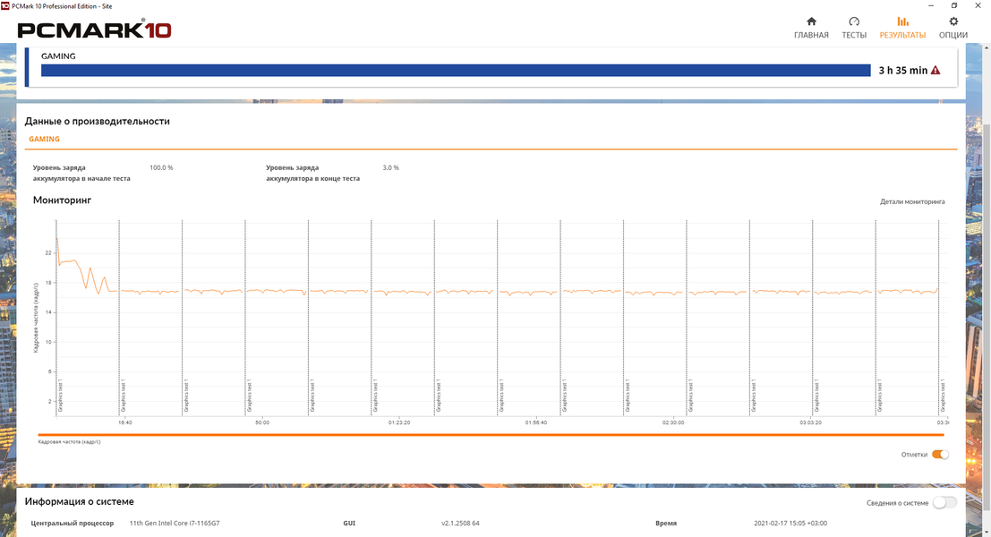 Только в самом начале теста процессор ультрабука работает на частоте, превышающей 4,0 ГГц, причем с тротлингом. Затем частота снижается до 3,0 ГГц, а далее и вовсе стабилизируется на 2,1 ГГц. Температура при этом не превышает 70 °C, а энергопотребление — 16 Вт. При питании ультрабука от аккумулятора процессор не перегревается и в режим пропуска тактов не уходит, но его частота составляет всего 1,5 ГГц. Очевидно, что компактный корпус ультрабука и ограничения по размерам системы охлаждения не позволяют раскрыть весь потенциал процессора Intel Core i7-1165G7, поэтому можно предположить, что его производительность не будет впечатляющей. Кстати, о производительности ультрабука и пойдет речь далее.