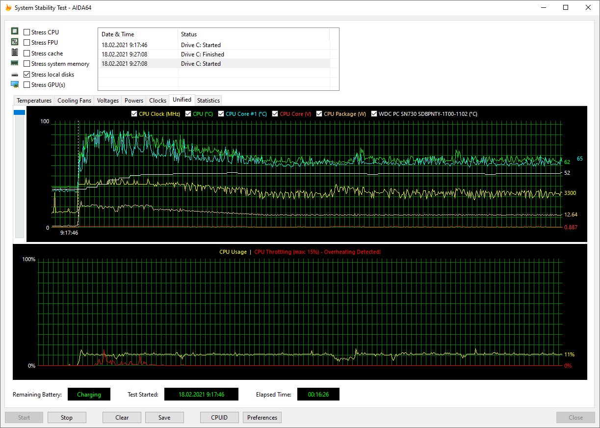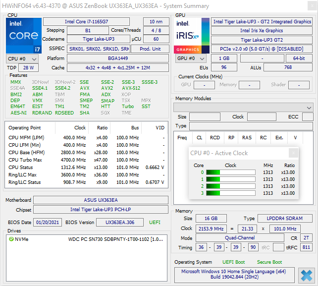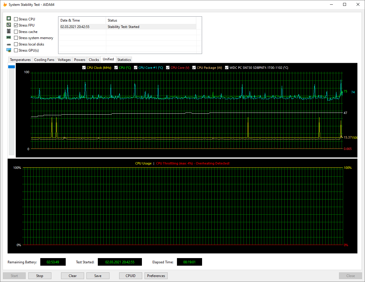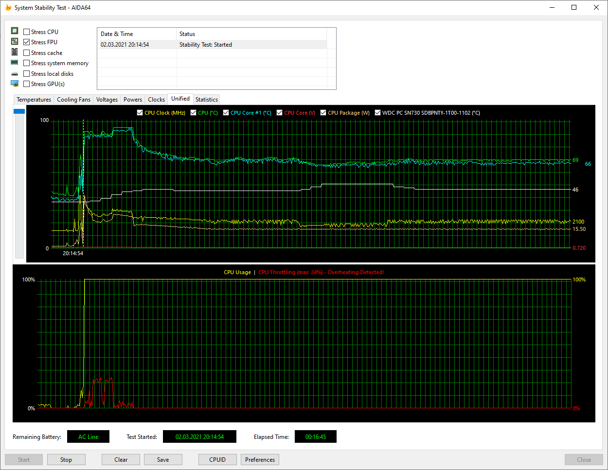 Стресс-тесты процессора ультрабука проводились под управлением операционной системы Windows 10 Pro 20H2 (19042.746) с установкой последних доступных драйверов и обновлений, а температура в помещении во время тестирования составляла около 26 °C. Нагрузка на центральный процессор создавалась встроенным FPU-тестом из утилиты AIDA64 Extreme.