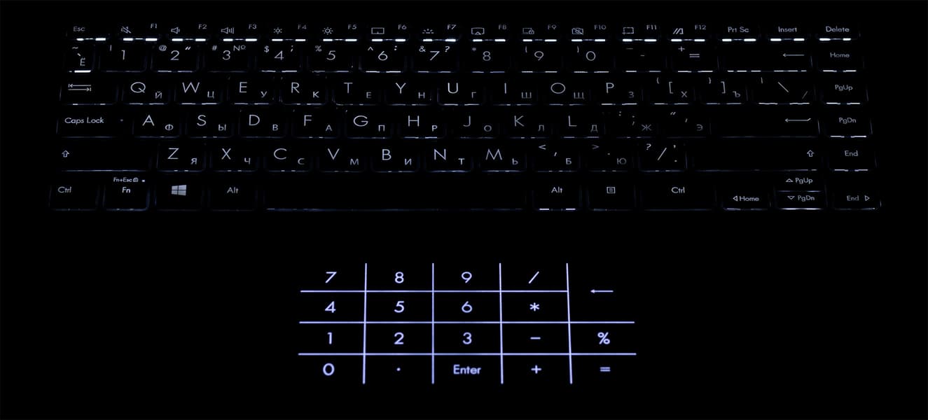 А вот фирменный NumberPad 2.0 размерами 130×65 мм подсвечивается ярче клавиатуры и это вызывает определенный диссонанс.