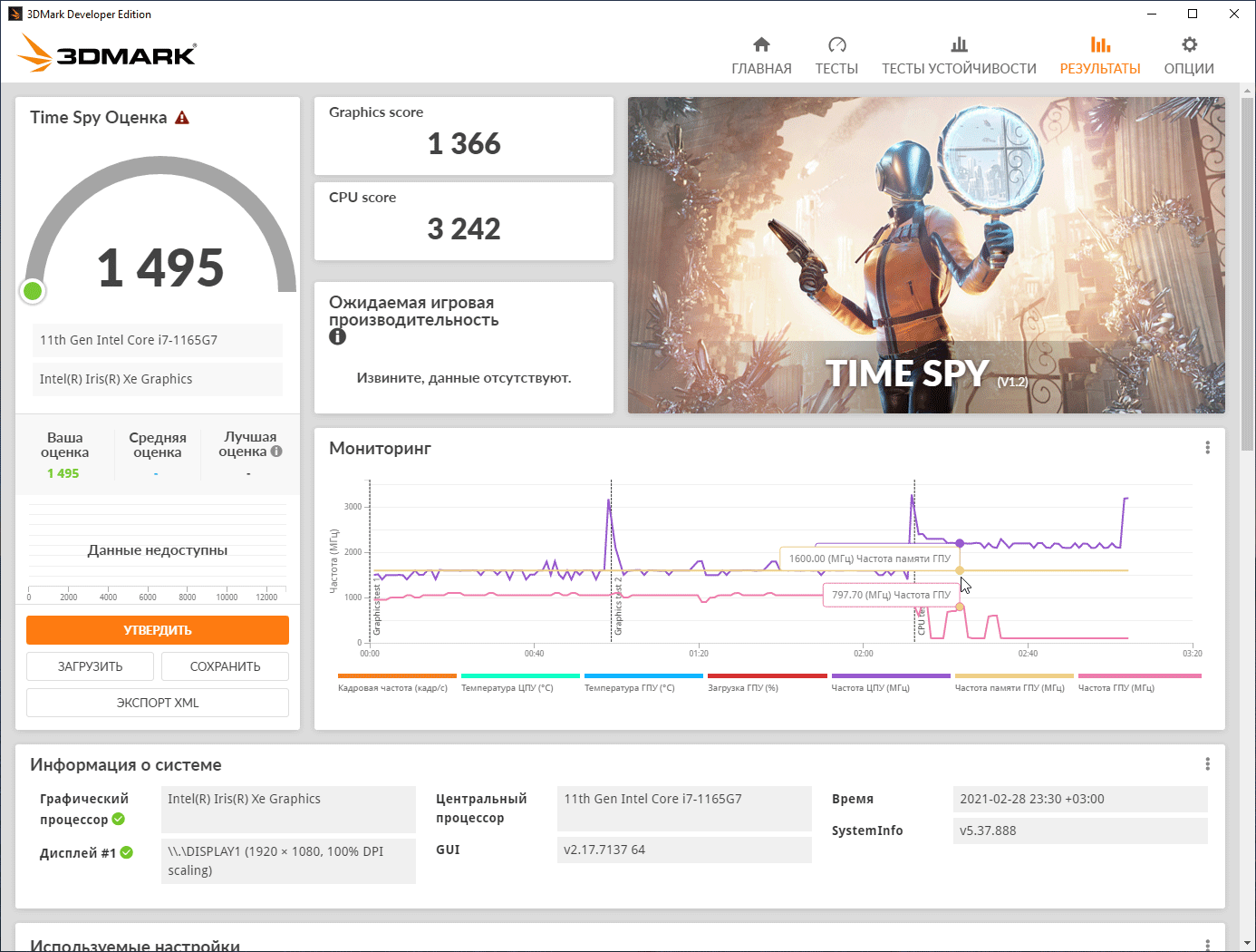 | Тест | Референсный результат | Asus ZenBook Flip 13 UX363EA (Intel Core i7-1165G7) | Asus ZenBook 14 UX435EG (Intel Core i7-1165G7) |