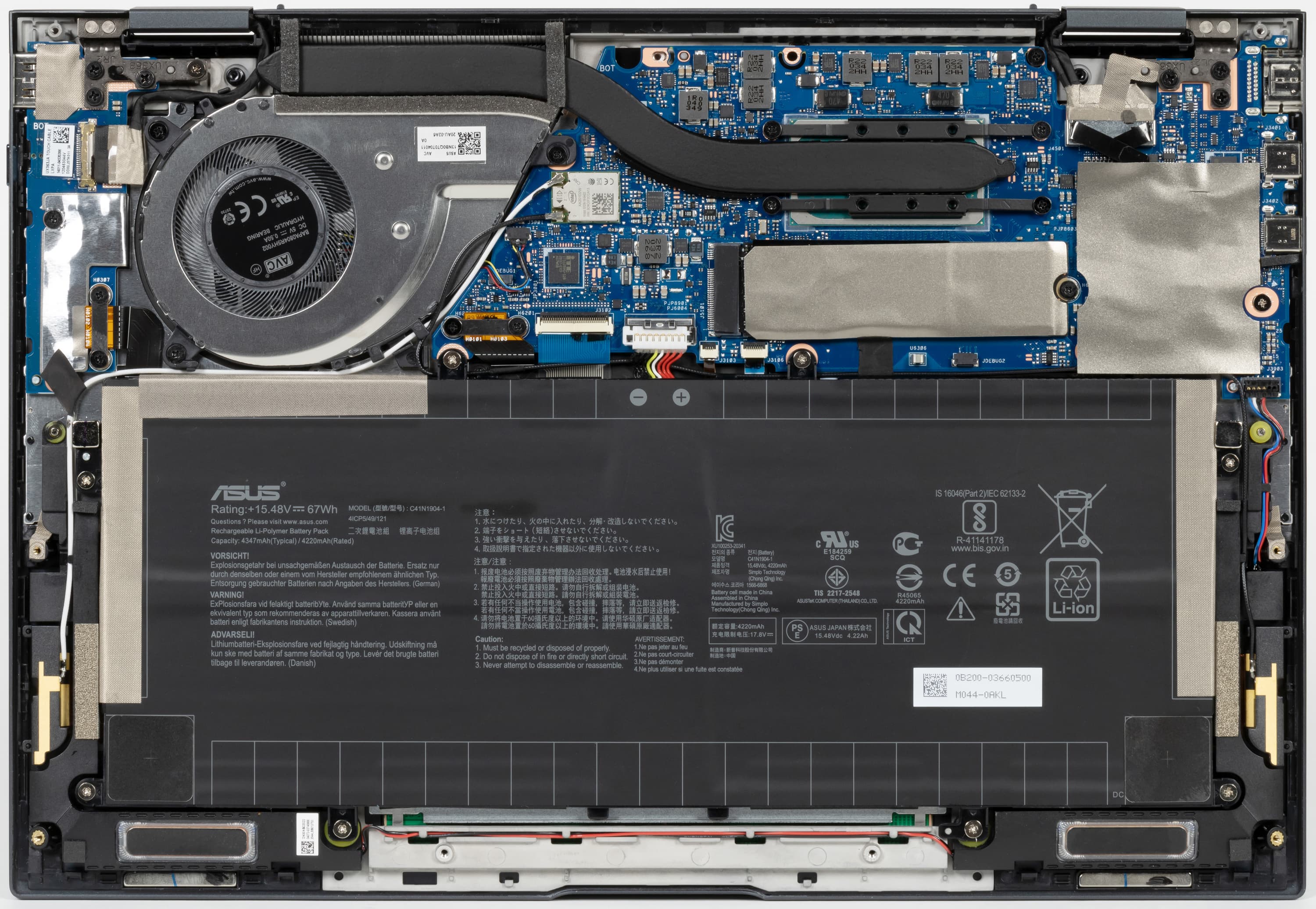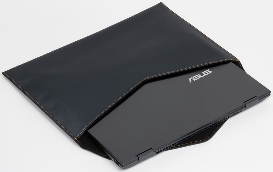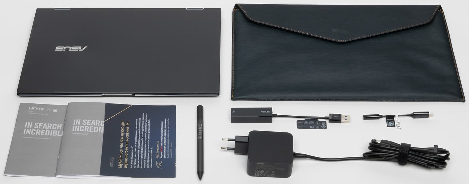 Комплект поставки непривычно широкий для ноутбуков последнего времени. В него включены мягкий кожаный конверт, переходники-адаптеры USB-A → RJ45 и USB-C → аудиоразъем, стилус Asus Pen (4096 уровней давления от 10 до 300 г), адаптер питания и инструкции.