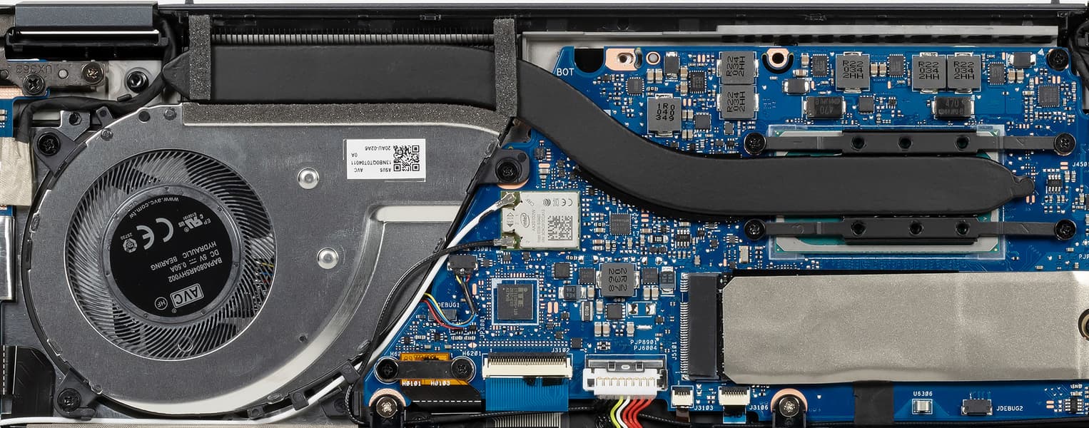 Если ноутбук не нагружать совсем, то его система охлаждения работает бесшумно, скорее всего в пассивном режиме. Прижавшись ухом к корпусу ноутбука, что-то расслышать можно (это может быть шум электроники), но уже в сантиметре ничего не слышно. В случае большой нагрузки на процессор и/или видеокарту шум от системы охлаждения невысокий — за исключением режима высокой производительности, в котором шум повышается и с периодом в несколько минут то достигает высокого уровня, то снижается до приемлемого.