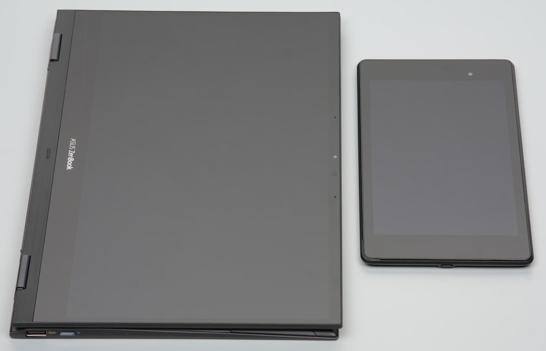 Судя по яркости отраженных объектов, антибликовые свойства экрана чуть лучше, чем у планшета Google Nexus 7 (2013) (далее просто Nexus 7). Для наглядности приведем фотографию, на которой в экранах обоих устройств отражается белая поверхность (где что — разобраться несложно):