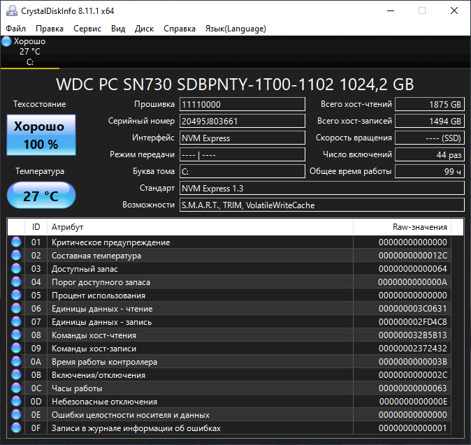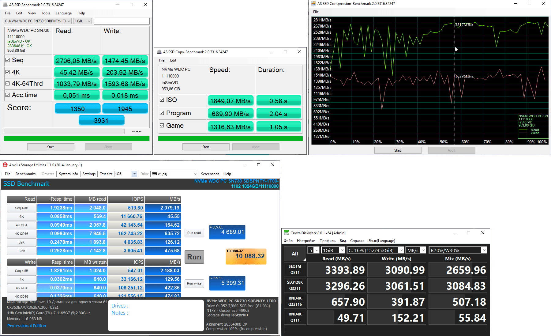 | Накопитель | M.2 NVMe SSD 1 ТБ PCIe 3.0 x4, Western Digital PC SN730 (модель SDBPNTY-1T00-1102) | |