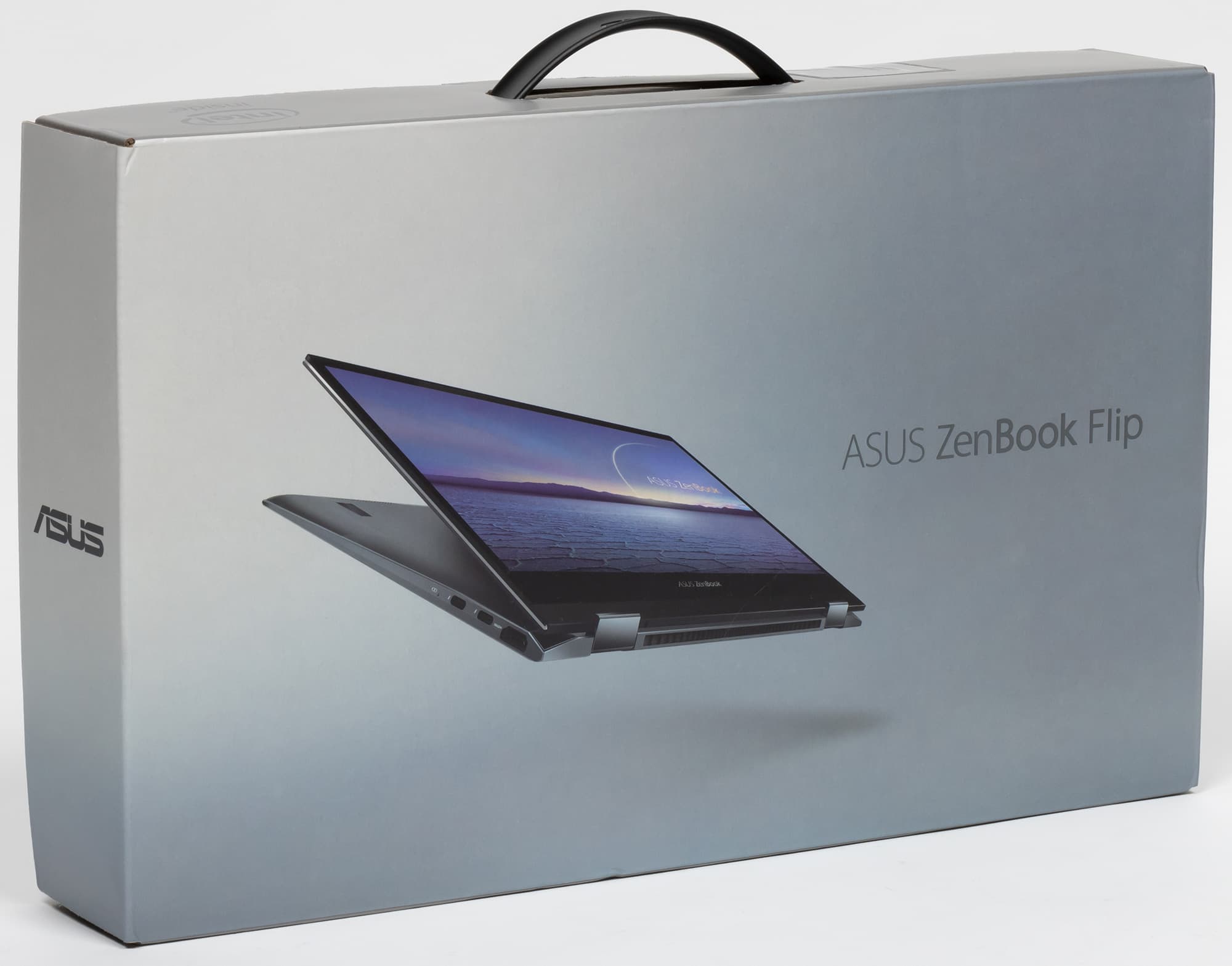 Картонная коробка, в которой поставляется ультрабук Asus ZenBook Flip 13 UX363EA, оснащена пластиковой ручкой и на лицевой стороне содержит изображение самого устройства в необычном разложенном виде.