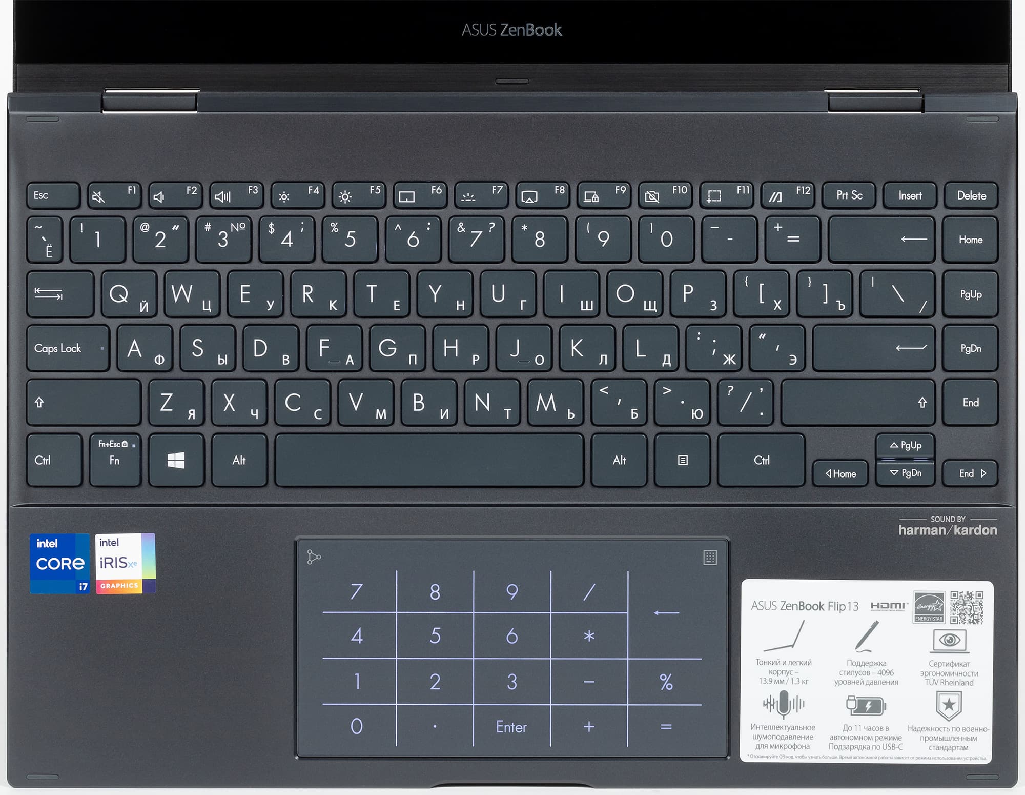 Asus ZenBook Flip 13 UX363EA оснащен клавиатурой мембранного типа с функциональными клавишами и столбиком дополнительных клавиш справа.