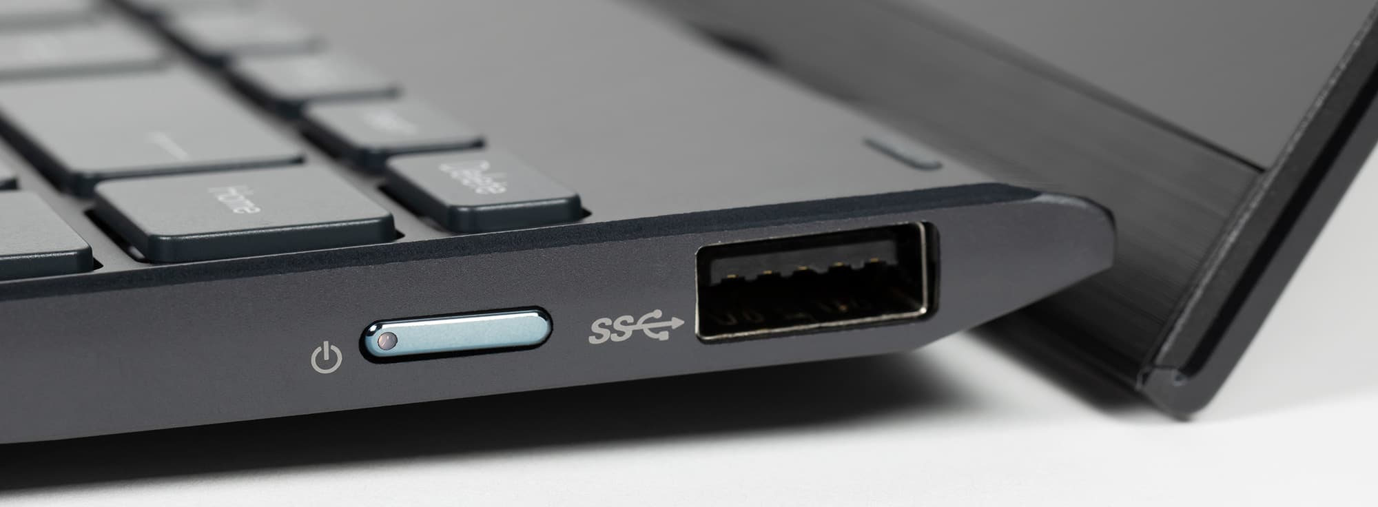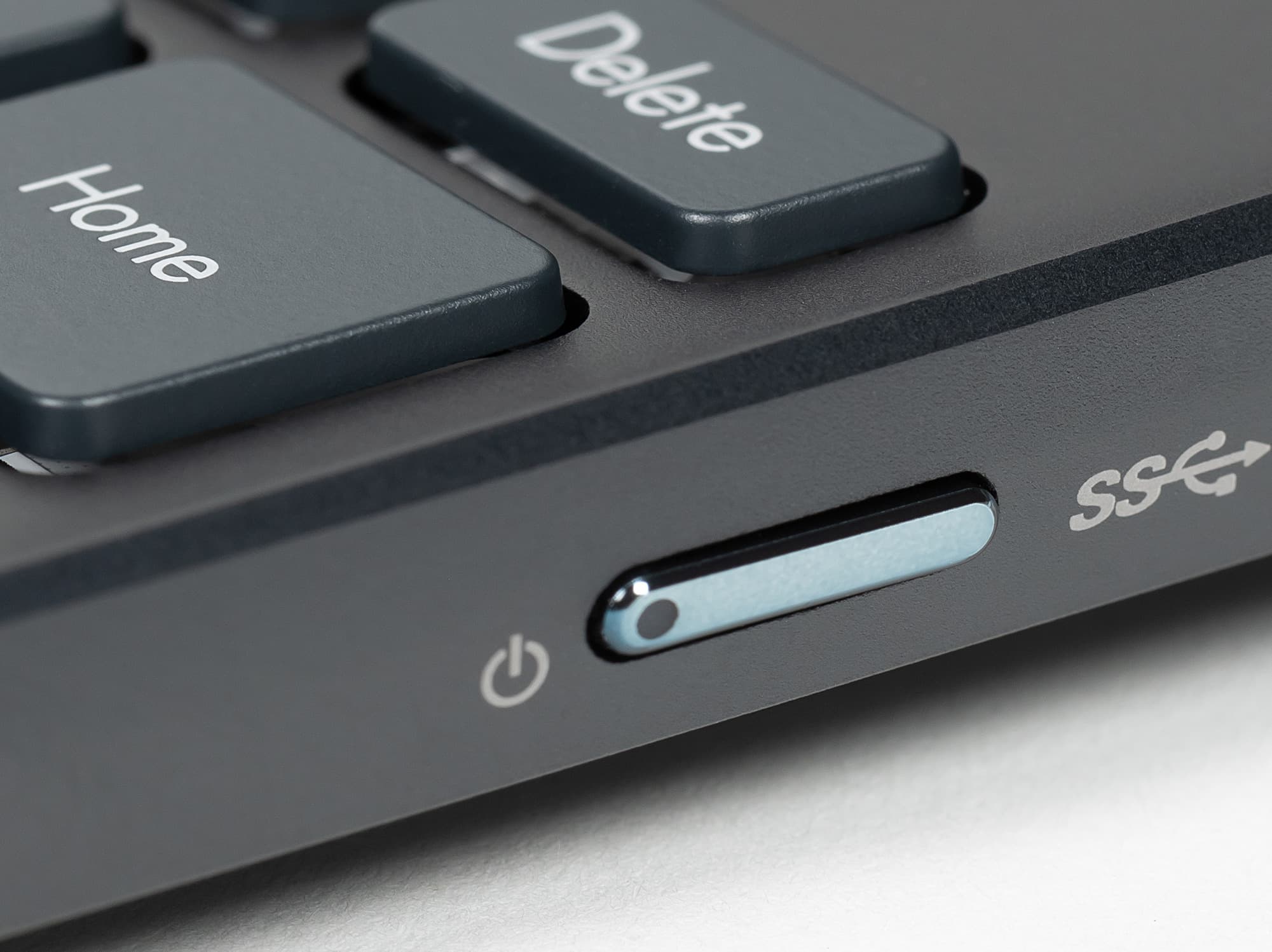 Кнопка включения ультрабука расположена не рядом с клавишей Del, как на предыдущих ZenBook, а с правого торца — потому что надо иметь возможность включать ноутбук, развернутый в планшет. Это удобно и позволяет полностью избежать случайных выключений во время печати.