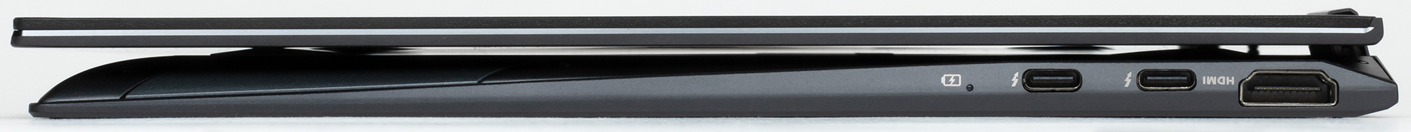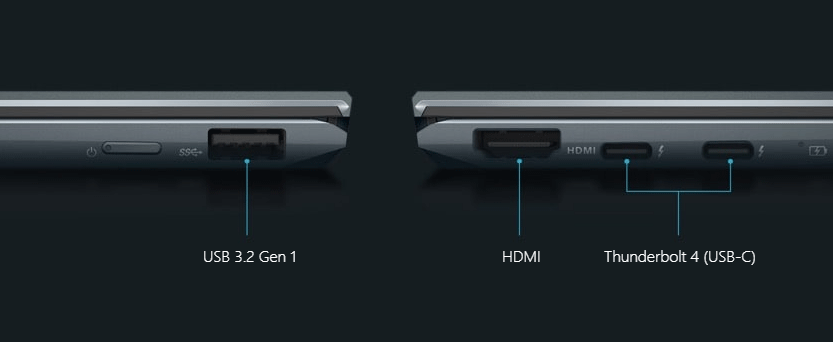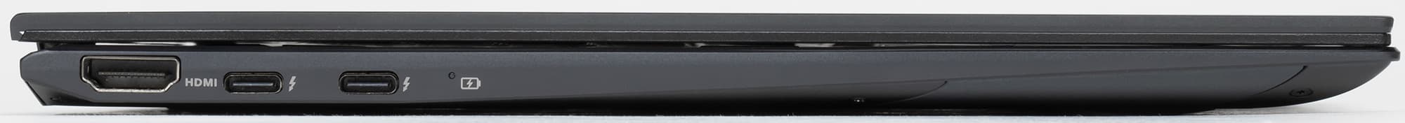 Все разъемы выведены на боковые стороны корпуса. Слева размещены видеовыход HDMI версии 1.4 и два USB 3.2 Gen2 (Type-C) интерфейса Thunderbolt 4 с поддержкой DisplayPort и стандарта Power Delivery, а справа — порт USB 3.2 Gen1 (Type-A) и кнопка включения с индикатором активности.