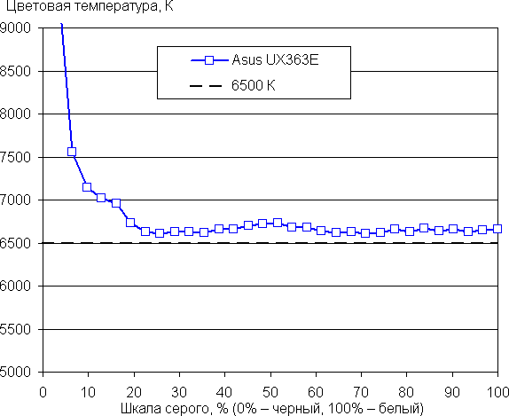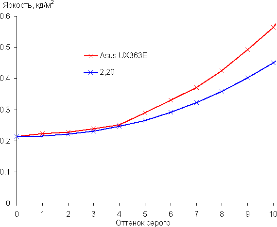 Вернемся к экрану тестируемого ноутбука. Если настройка яркости равна 0%, то яркость снижается до 17 кд/м². В полной темноте яркость его экрана получится понизить до комфортного уровня. Фактическая яркость очень нелинейно зависит от значения настройки. Сделано это явно для небольшого обмана пользователя, который едва снижая значение настройки, по факту сильно снижает яркость подсветки и увеличивает автономность ноутбука.