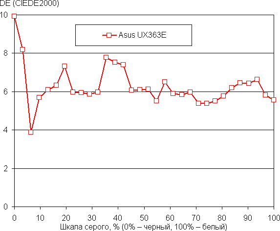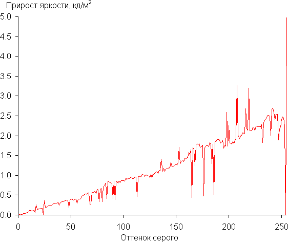 Далее мы измерили яркость 256 оттенков серого (от 0, 0, 0 до 255, 255, 255) при настройках по умолчанию. График ниже показывает прирост (не абсолютное значение!) яркости между соседними полутонами: