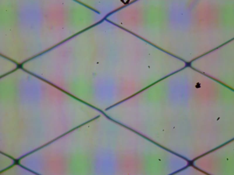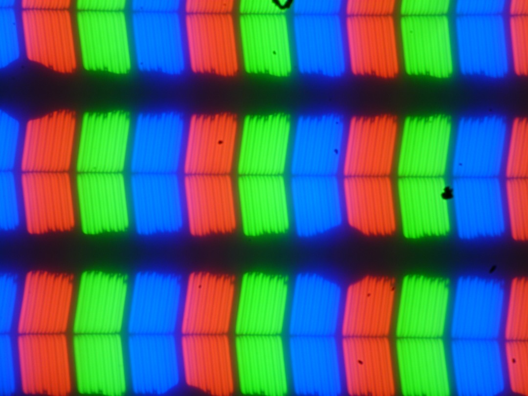 В этом ноутбуке используется матрица типа IPS. Микрофотографии демонстрируют типичную для IPS структуру субпикселей (черные точки — это пыль на матрице фотоаппарата):