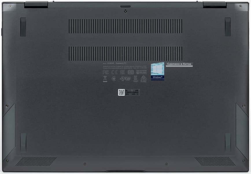 В отличие от рабочей панели и крышки, основание у ультрабука пластиковое. На нем выделим две вентиляционные решетки и четыре резиновые ножки.