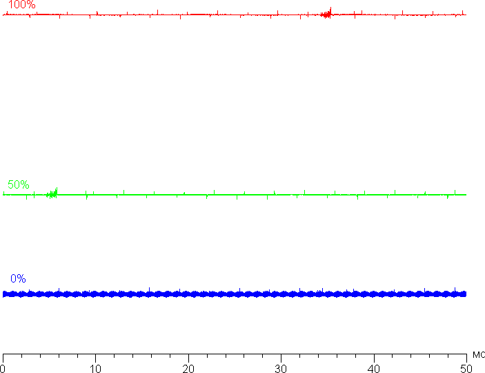 На любом уровне яркости значимая модуляция подсветки отсутствует, поэтому нет и никакого мерцания экрана. В доказательство приведем графики зависимости яркости (вертикальная ось) от времени (горизонтальная ось) при различных значениях настройки яркости: